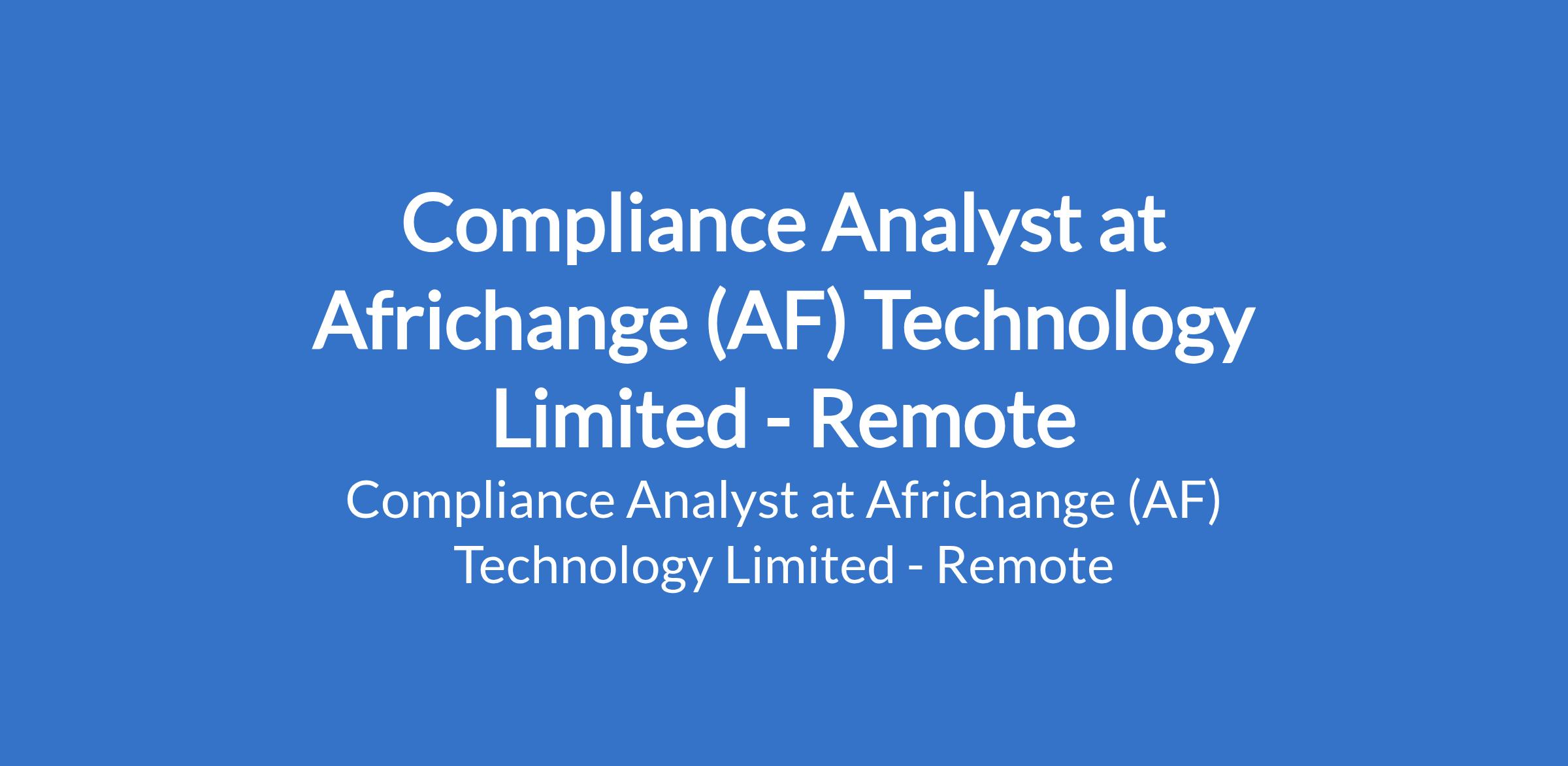 Africhange (AF) Technology Limited is recruiting to fill the position of: Compliance Analyst. This is a Remote Job. Interested candidates should possess a Bachelors Degree in either Law, Finance, Economics, Banking, Information Management. Legal background is an added advantage with at least 3 years experience in similar role with basic understanding of the countrys financial legislation.