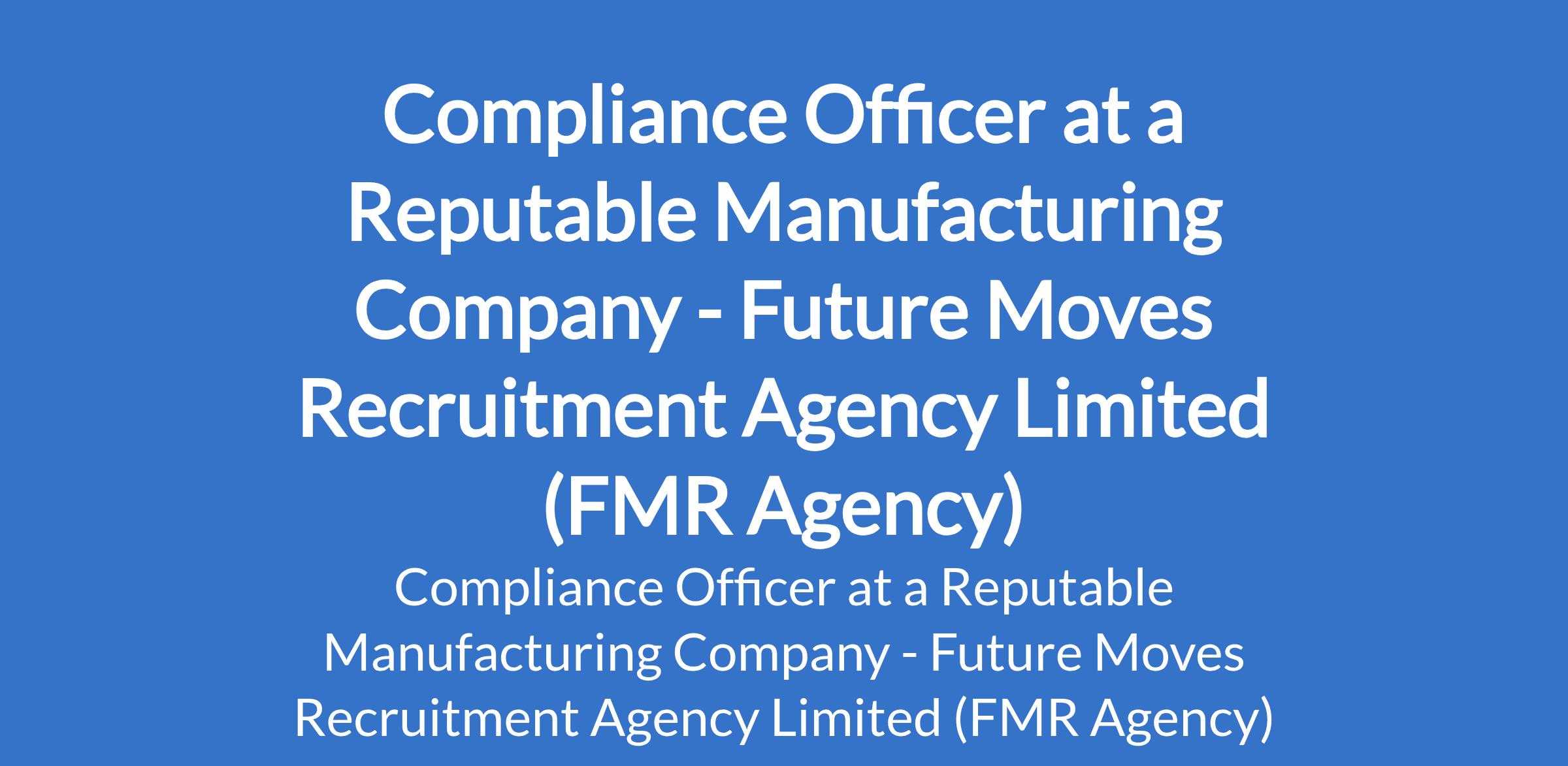 Future Moves Recruitment Agency Limited (FMR Agency) - Our client, reputable manufacturing company is recruiting to fill the position of: Compliance Officer. The position is located in Kano State. Salary: N200,000 - N400,000 per month. Interested candidates should possess a Bachelors Degree in Accounting, Business Administration, Law, or a related field with a minimum of 4 years experience in compliance, audit, or documentation management.