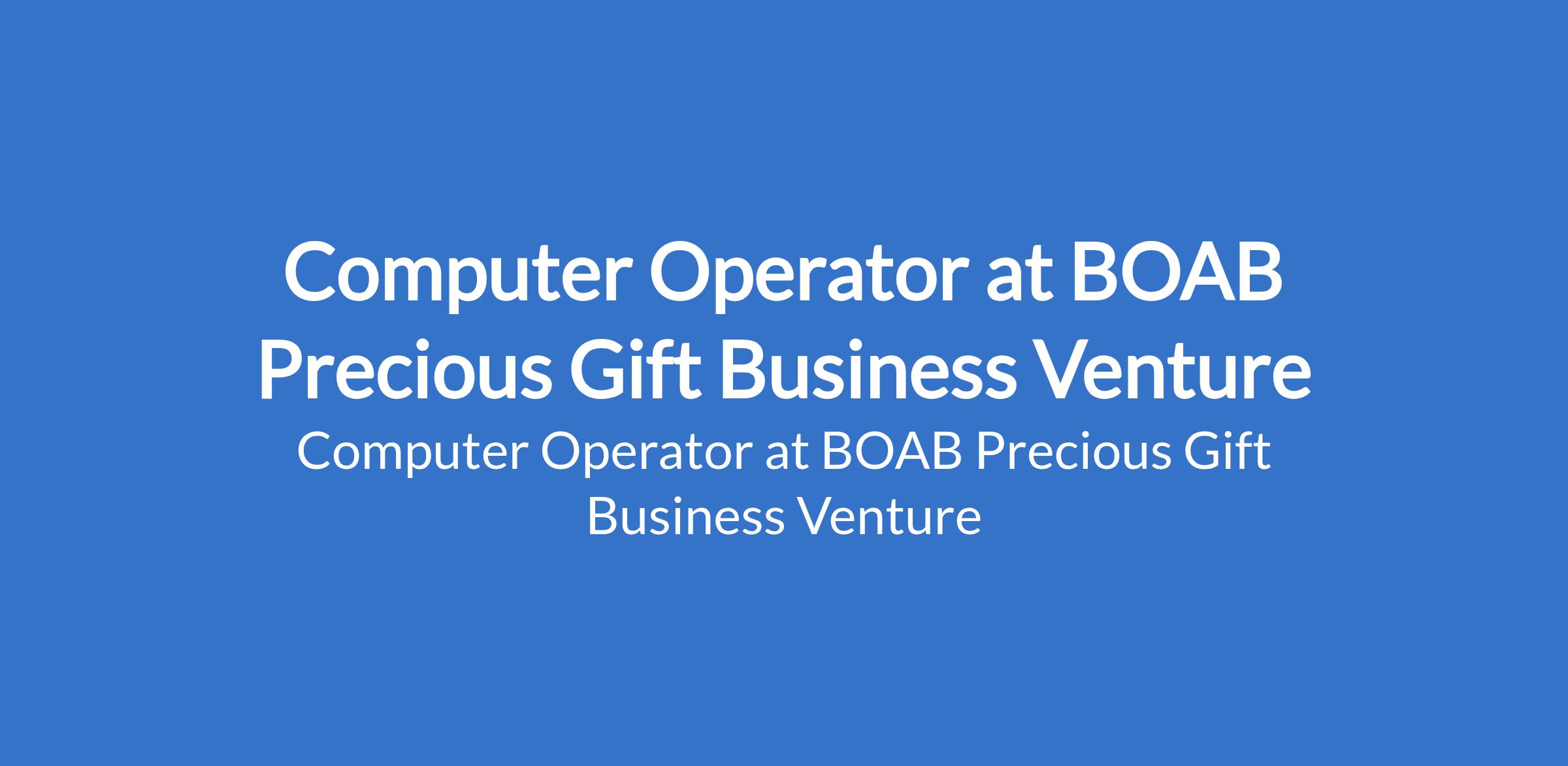 BOAB Precious Gift Business Venture is recruiting to fill the position of: Computer Operator. The position is located in Mowe, Ogun State. Salary: N30,000 - N35,000 / month. Interested candidates should possess an NCE / OND / HND in any relevant field with proven experience as a computer operator or similar role is an advantage.