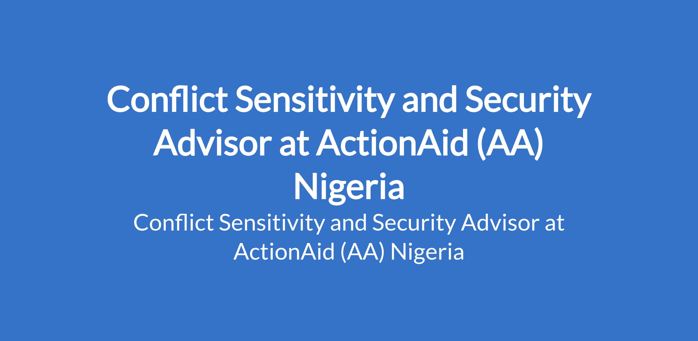 ActionAid (AA) Nigeria is recruiting to fill the position of: Conflict Sensitivity and Security Advisor. The position is located in Abuja. Interested candidates should possess a First Degree in Peace and Conflict Studies, Political Science, Sociology, Development Studies, International Relations or other relevant Social Sciences with a minimum of five (5) years progressive experience in conducting conflict sensitivity and conflict analysis at national and state levels.
