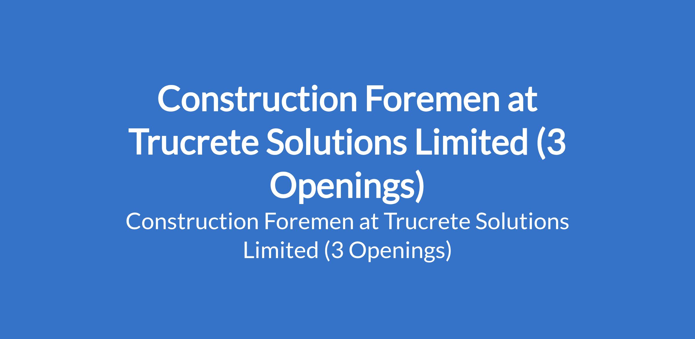 Trucrete Solutions Limited is recruiting to fill the position of: Construction Foreman. The position is located in Lokoja, Kogi State. Interested candidates should possess a High School Diploma or a Diploma in a skilled trade (e.g., Operator or Technician) with a minimum of 10 years of experience in the construction industry.