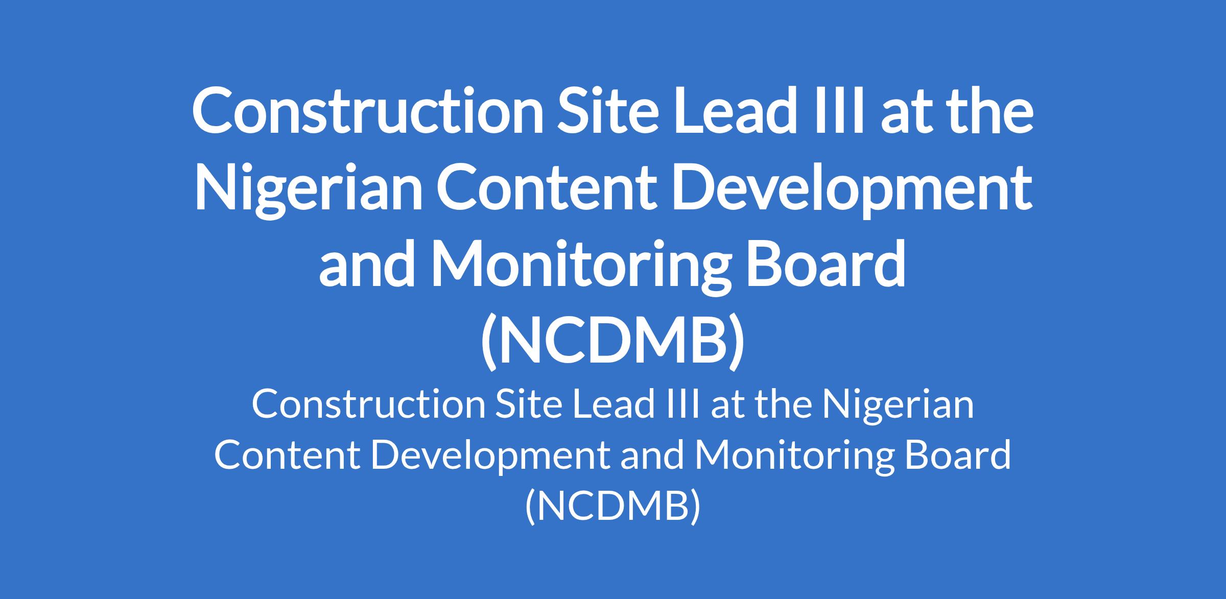 The Nigerian Content Development and Monitoring Board (NCDMB) is recruiting to fill the position of: Construction Site Lead III. Interested candidates should possess a Bachelor's Degree in Engineering, Construction, or related disciplines with a minimum 10 years experience in oil & gas construction supervision of surveillance.