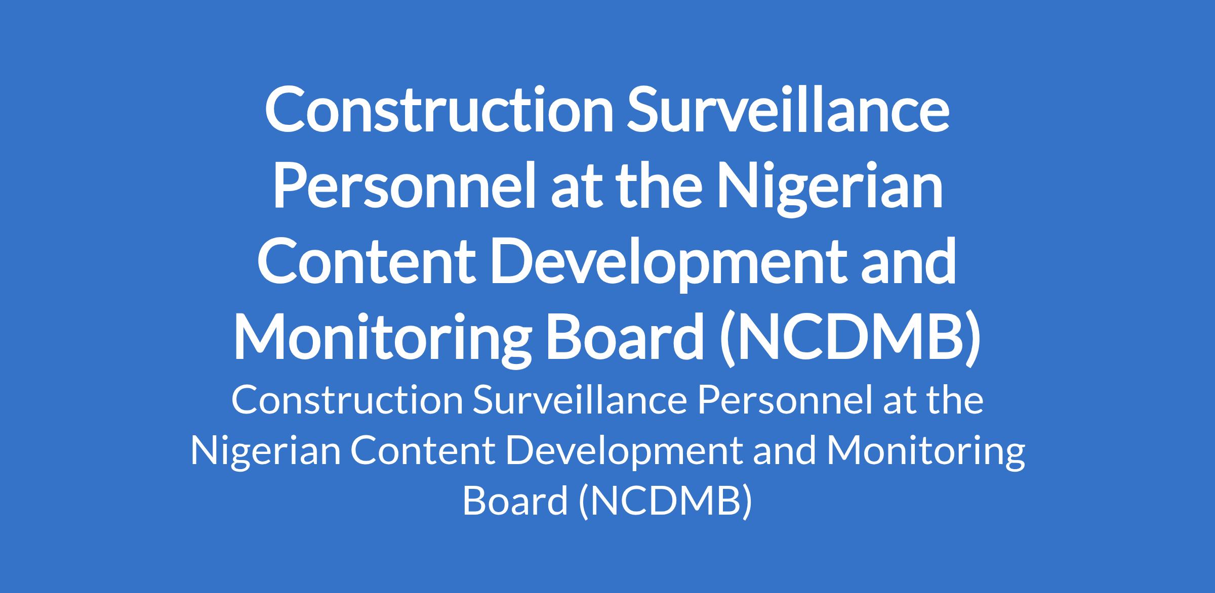 The Nigerian Content Development and Monitoring Board (NCDMB) is recruiting to fill the position of: Construction Surveillance Personnel. Interested candidates should possess a Bachelor's Degree in Engineering, Construction, or related discipline with a minimum of 10 years experience in oil & gas construction supervision or surveillance.