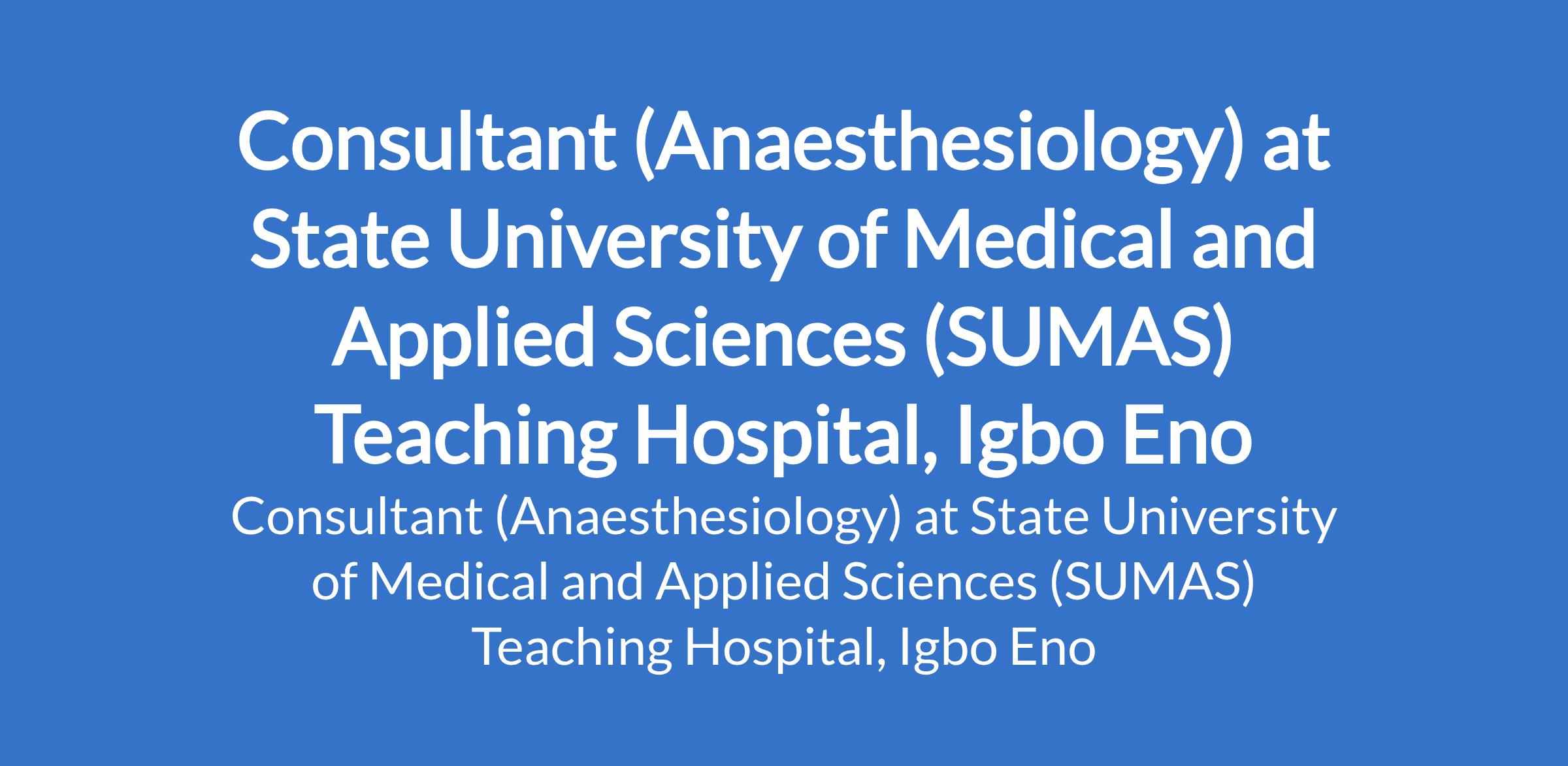 State University of Medical and Applied Sciences (SUMAS) Teaching Hospital, Igbo Eno invites applications from suitable candidates for the position of: Consultant (Anaesthesiology). The position is located in Enugu State. Interested candidates should possess a Bachelor of Surgery or equivalent in a relevant field from a recognized institution, Fellowship of the National Postgraduate Medical Colege of Nigeria or the West African College of Surgeons/Physicians (FWACS/FWACP), with full registration with the Medical and Dental Council of Nigeria (MDCN) and valid practicing license.