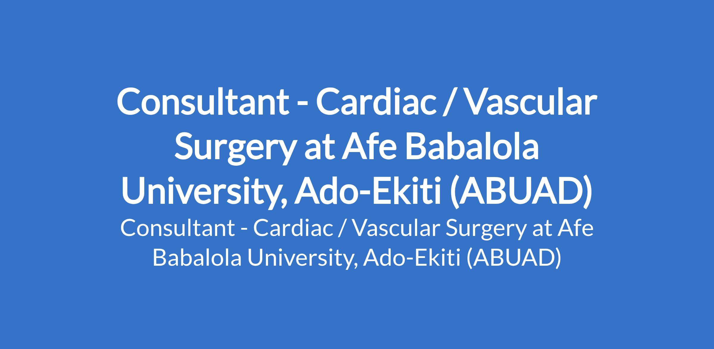 Afe Babalola University, Ado-Ekiti (ABUAD) is recruiting to fill the position of: Consultant - Cardiac / Vascular Surgery. The position is located in Ekiti State. Interested candidates should possess relevant qualifications and be must be fully registered with the Medical and Dental Council of Nigeria; Evidence of having completed NYSC is mandatory.