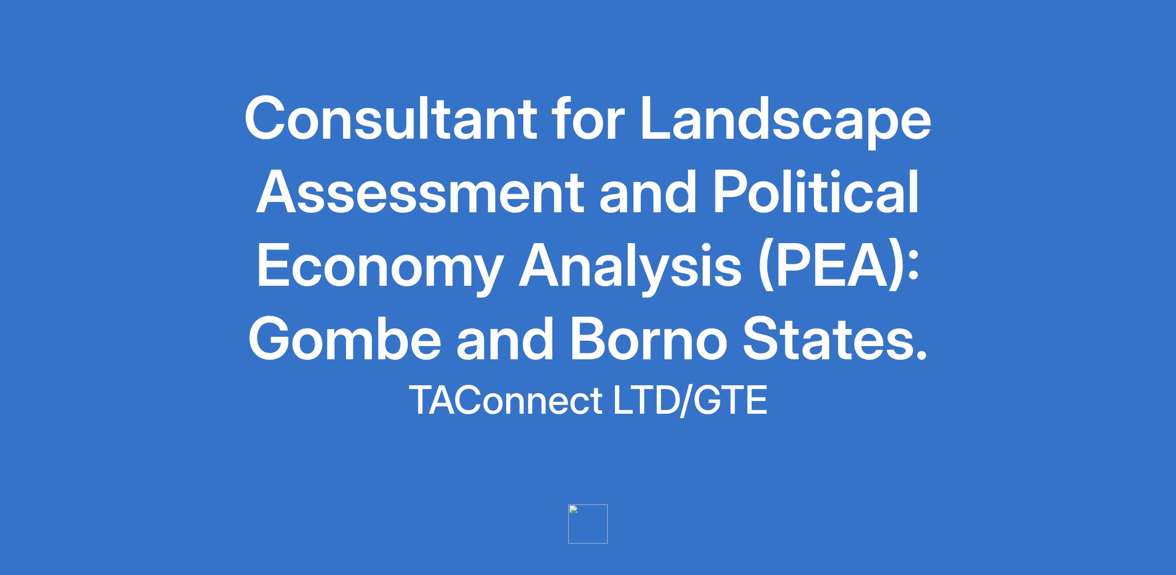 This scope of work (SOW) sets forth the services to be provided by the Consultant for Landscape Assessment and Political Economy Analysis (PEA): Gombe and Borno States, for Technical Advice Connect LTD/GTE (TAConnect), a non-profit organization registered and based in Nigeria to bring innovative solutions to the provision of Technical Assistance (TA) services to states in Nigeria.