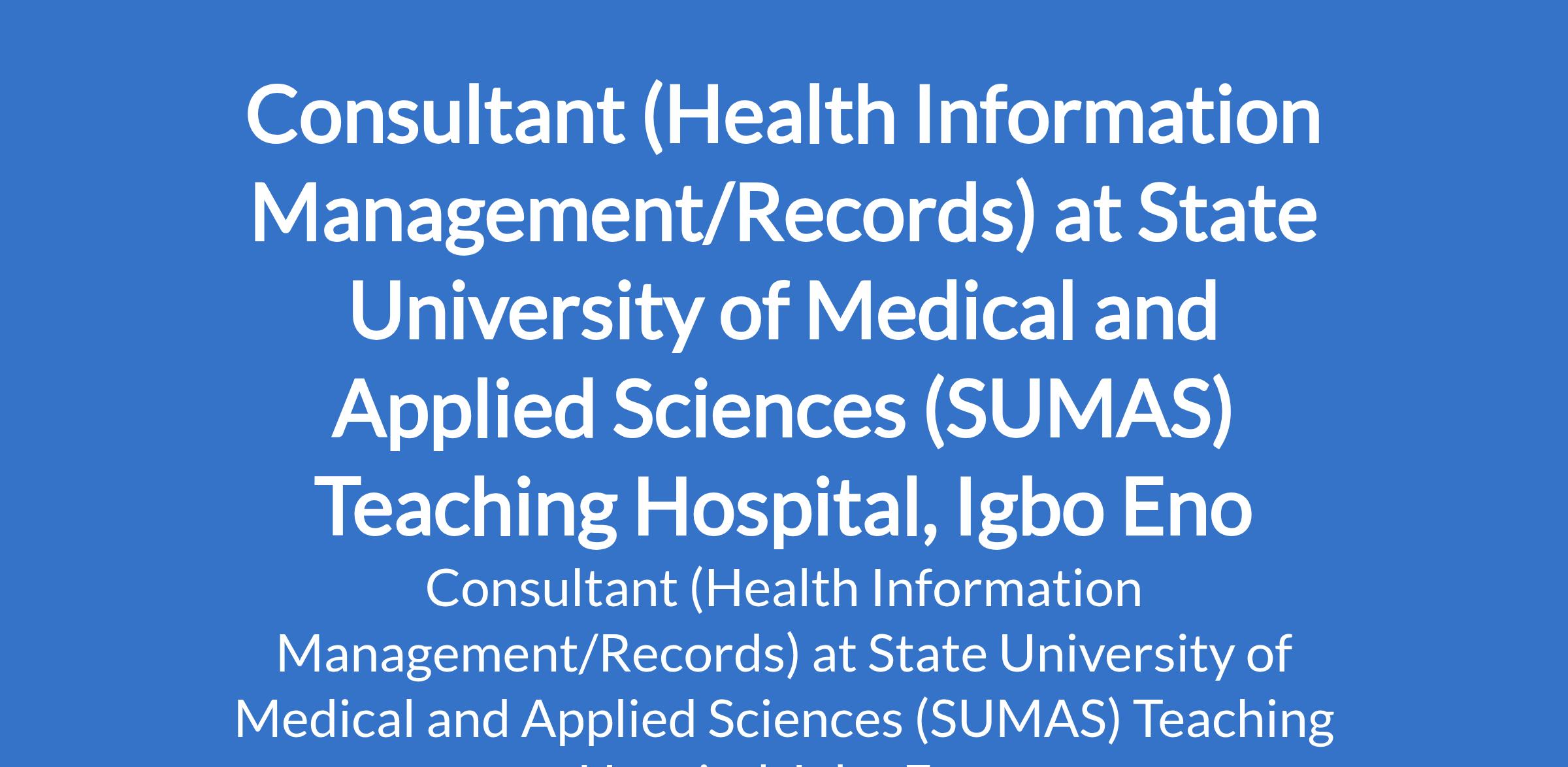 State University of Medical and Applied Sciences (SUMAS) Teaching Hospital, Igbo Eno invites applications from suitable candidates for the position of: Consultant (Health Information Management/Records). The position is located in Enugu State. Interested candidates should possess a Degree / Higher National Diploma in Statistics or Degree in Physical sciences or Biological sciences from a recognized Institution plus National Youth Service Corp Certificate (NYSC) or Exemption certificate.