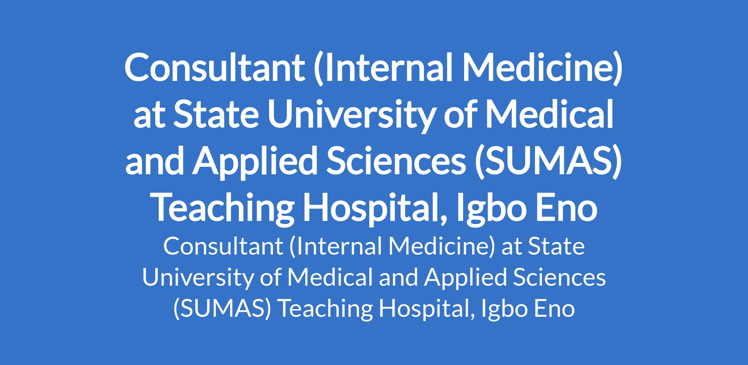 State University of Medical and Applied Sciences (SUMAS) Teaching Hospital, Igbo Eno invites applications from suitable candidates for the position of: Consultant (Internal Medicine). The position is located in Enugu State. Interested candidates should possess a Bachelor of Surgery or equivalent in a relevant field from a recognized institution, Fellowship of the National Postgraduate Medical Colege of Nigeria or the West African College of Surgeons/Physicians (FWACS/FWACP), with full registration with the Medical and Dental Council of Nigeria (MDCN) and valid practicing license.