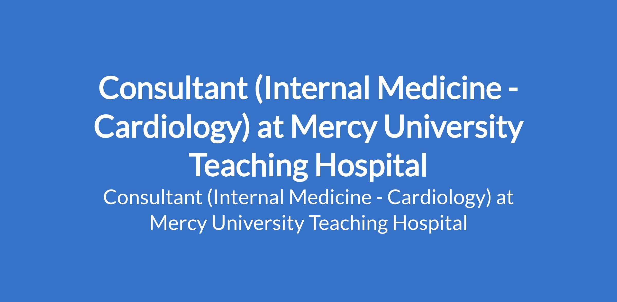 Mercy University Teaching Hospital invites applications from suitable candidates to fill the position of: Consultant (Internal Medicine - Cardiology). The position is located in Ile-Idande, Osogbo - Osun State. Interested candidates must be fully registered with the Medical and Dental Council of Nigeria, possess NYSC completion or exemption certificate and must be a fellow of either West African College of Surgeon or National Postgraduate Medical College of Nigeria or equivalent.