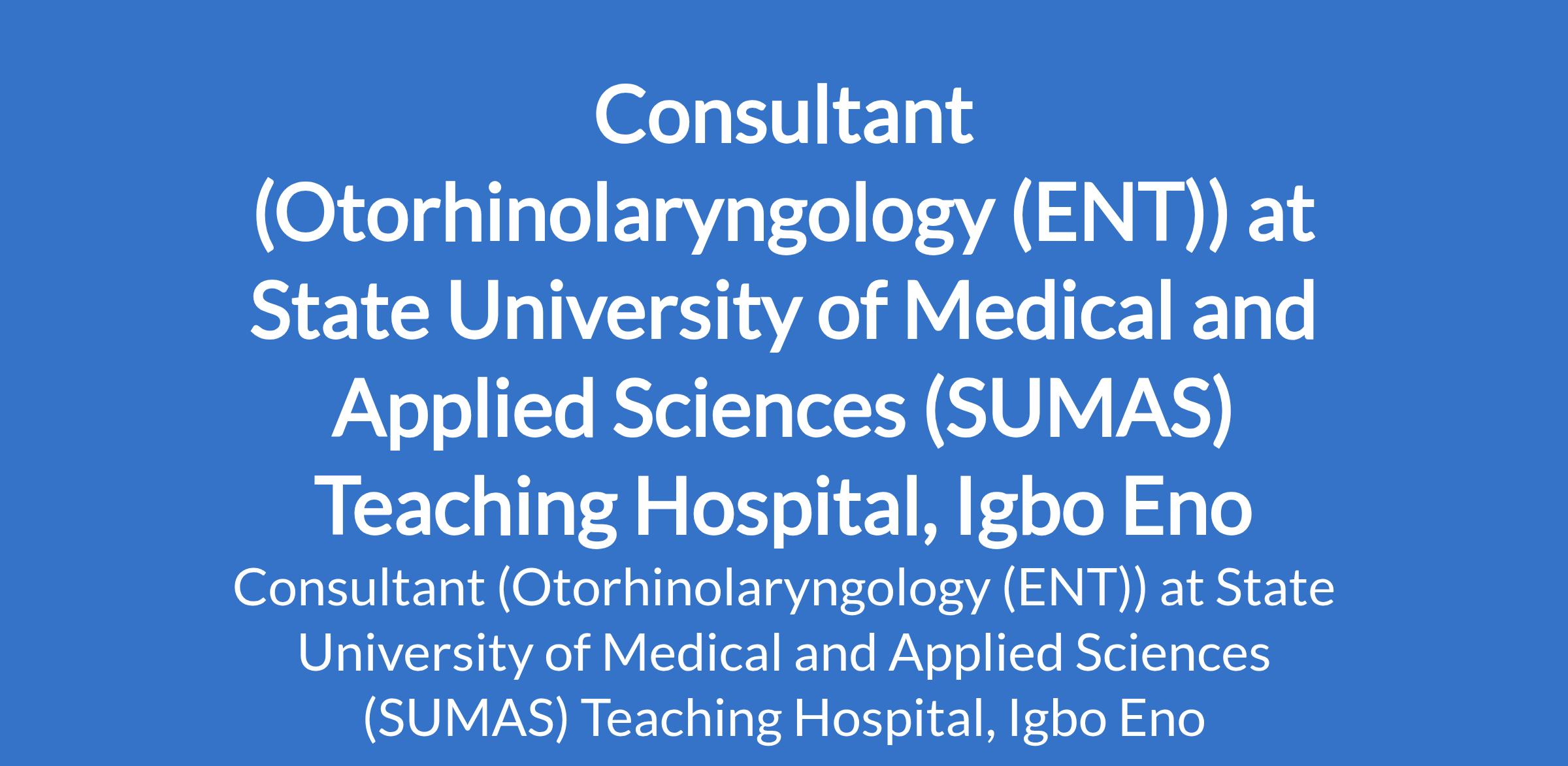 State University of Medical and Applied Sciences (SUMAS) Teaching Hospital, Igbo Eno invites applications from suitable candidates for the position of: Consultant (Otorhinolaryngology (ENT)). The position is located in Enugu State. Interested candidates should possess a Bachelor of Surgery or equivalent in a relevant field from a recognized institution, Fellowship of the National Postgraduate Medical Colege of Nigeria or the West African College of Surgeons/Physicians (FWACS/FWACP), with full registration with the Medical and Dental Council of Nigeria (MDCN) and valid practicing license.