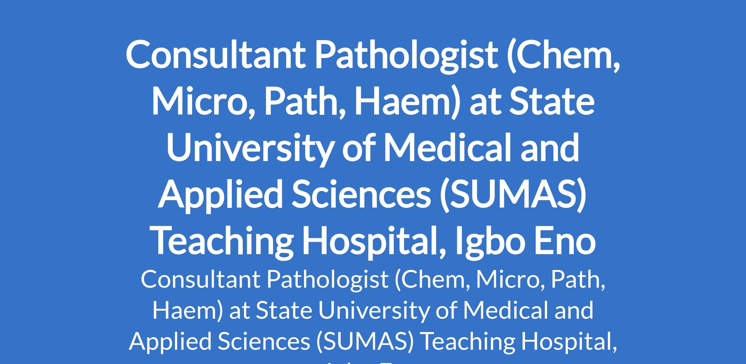 State University of Medical and Applied Sciences (SUMAS) Teaching Hospital, Igbo Eno invites applications from suitable candidates for the position of: Consultant Pathologist (Chem, Micro, Path, Haem). The position is located in Enugu State. Interested candidates should possess a Bachelor of Surgery or equivalent in a relevant field from a recognized institution, Fellowship of the National Postgraduate Medical Colege of Nigeria or the West African College of Surgeons/Physicians (FWACS/FWACP), with full registration with the Medical and Dental Council of Nigeria (MDCN) and valid practicing license.