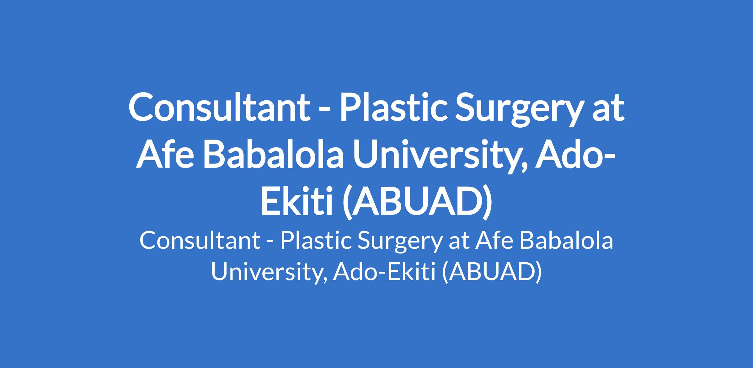 Afe Babalola University, Ado-Ekiti (ABUAD) is recruiting to fill the position of: Consultant - Plastic Surgery. The position is located in Ekiti State. Interested candidates should possess relevant qualifications and be must be fully registered with the Medical and Dental Council of Nigeria; Evidence of having completed NYSC is mandatory.