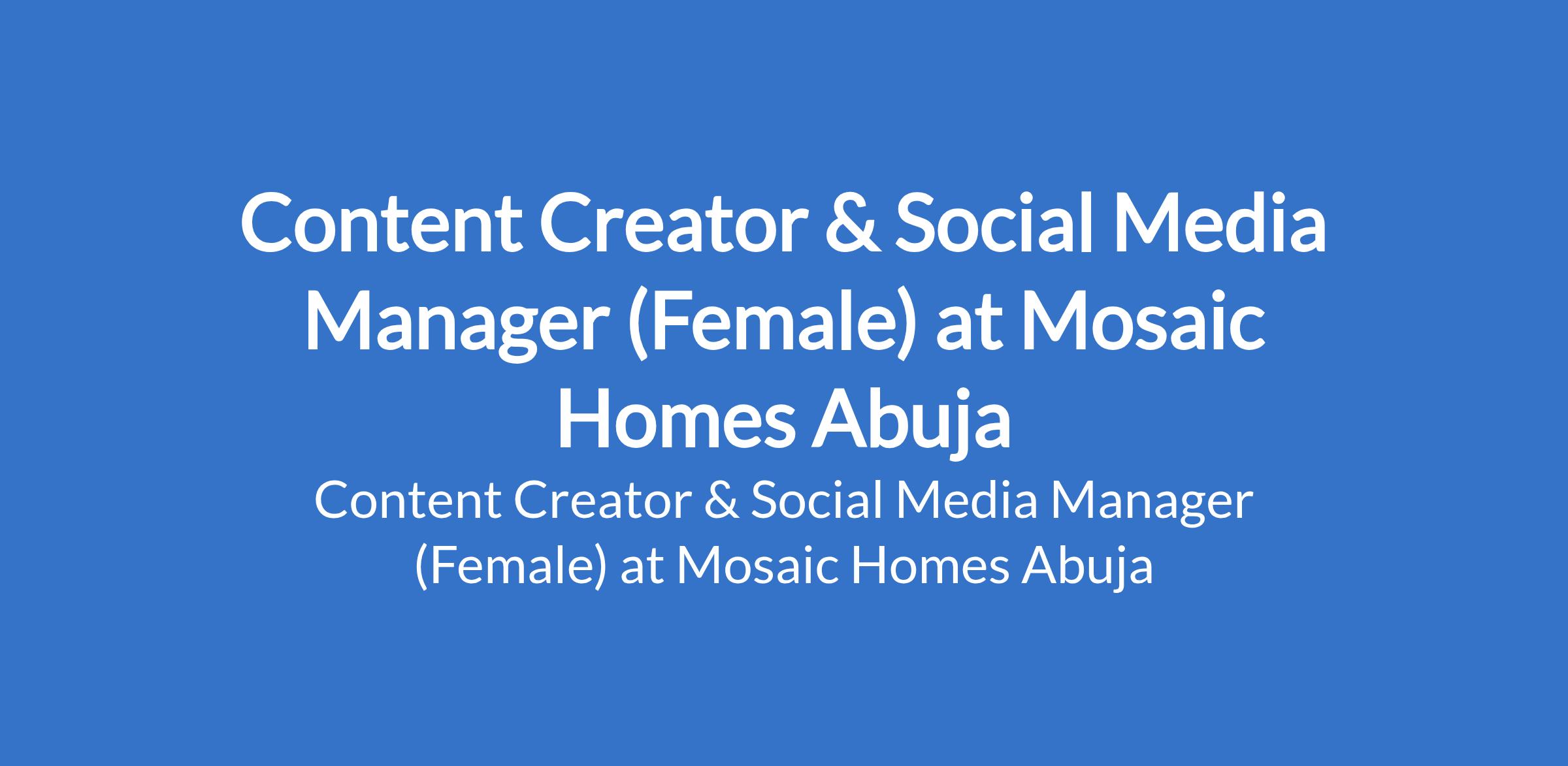 Mosaic Homes Abuja is recruiting to fill the position of: Content Creator & Social Media Manager (Female). The position is located in Abuja (FCT). Interested candidates should possess relevant qualifications with a minimum of 5 years proven experience as a Content Creator and / or Social Media Manager.
