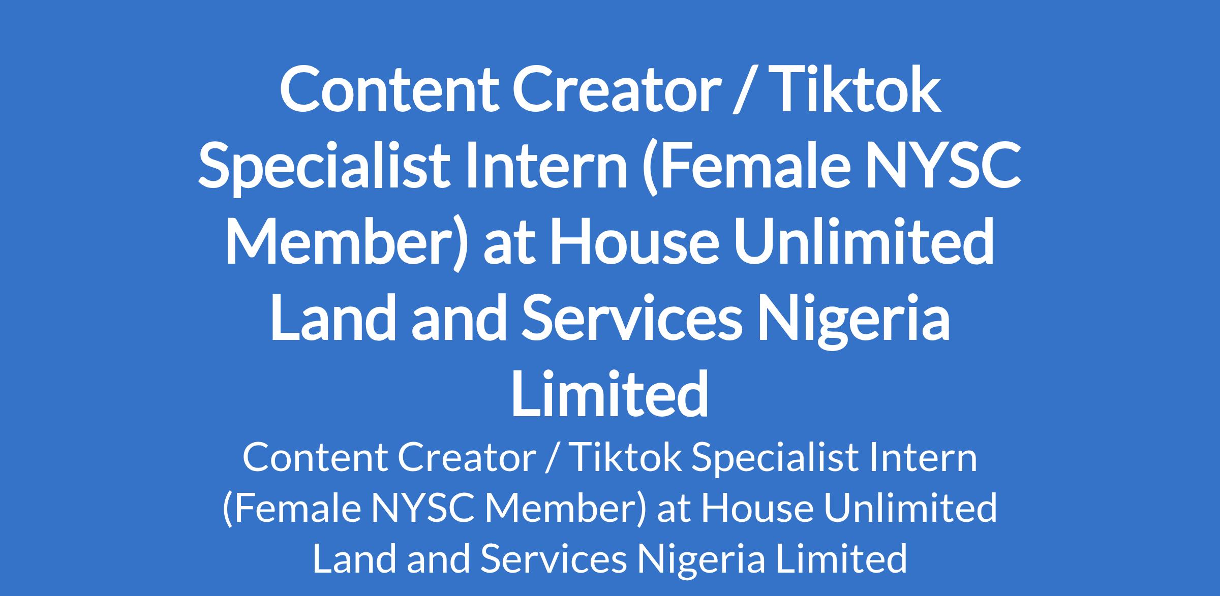 House Unlimited Land and Services Nigeria Limited is recruiting to fill the position of: Content Creator / Tiktok Specialist Intern (Female NYSC Member). The position is located in Suite S23 Febson Mall, Wuse Zone 4, Abuja (FCT). Salary: N50,000 monthly. Interested candidates should possess relevant qualifications and must be a serving Female NYSC corps member.