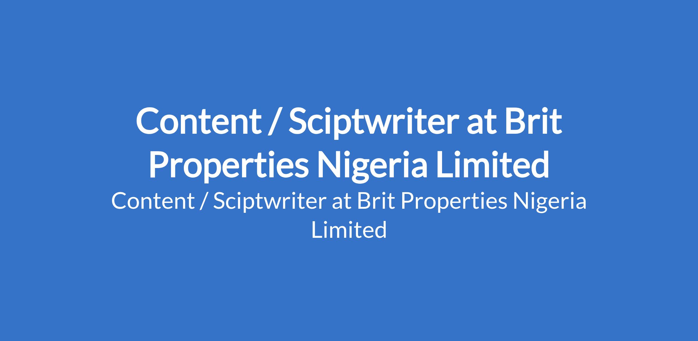 Brit Properties Nigeria Limited is recruiting to fill the position of: Content / Sciptwriter. The position is located in Ajah, Lagos State. Interested candidates should possess a Bachelors Degree in Mass Communication, English, Marketing, or related field with 2 4 years experience in content writing or script writing.