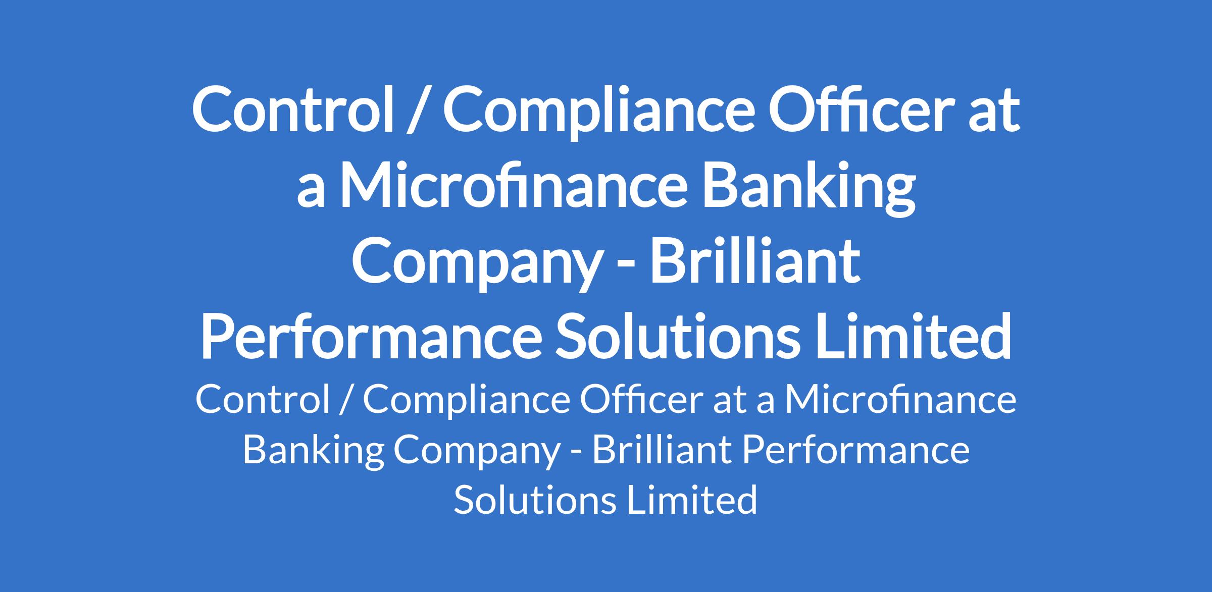 Brilliant Performance Solutions Limited - Our client, a Microfinance Banking Company is recruiting to fill the position of: Control / Compliance Officer. The position is located in Ipaja, Lagos State. Interested candidates should possess a BSc / HND in Banking, Finance, Economics or other related fields and must possess MCP, ICAN or ACCA with a minimum of 8 years of experience.