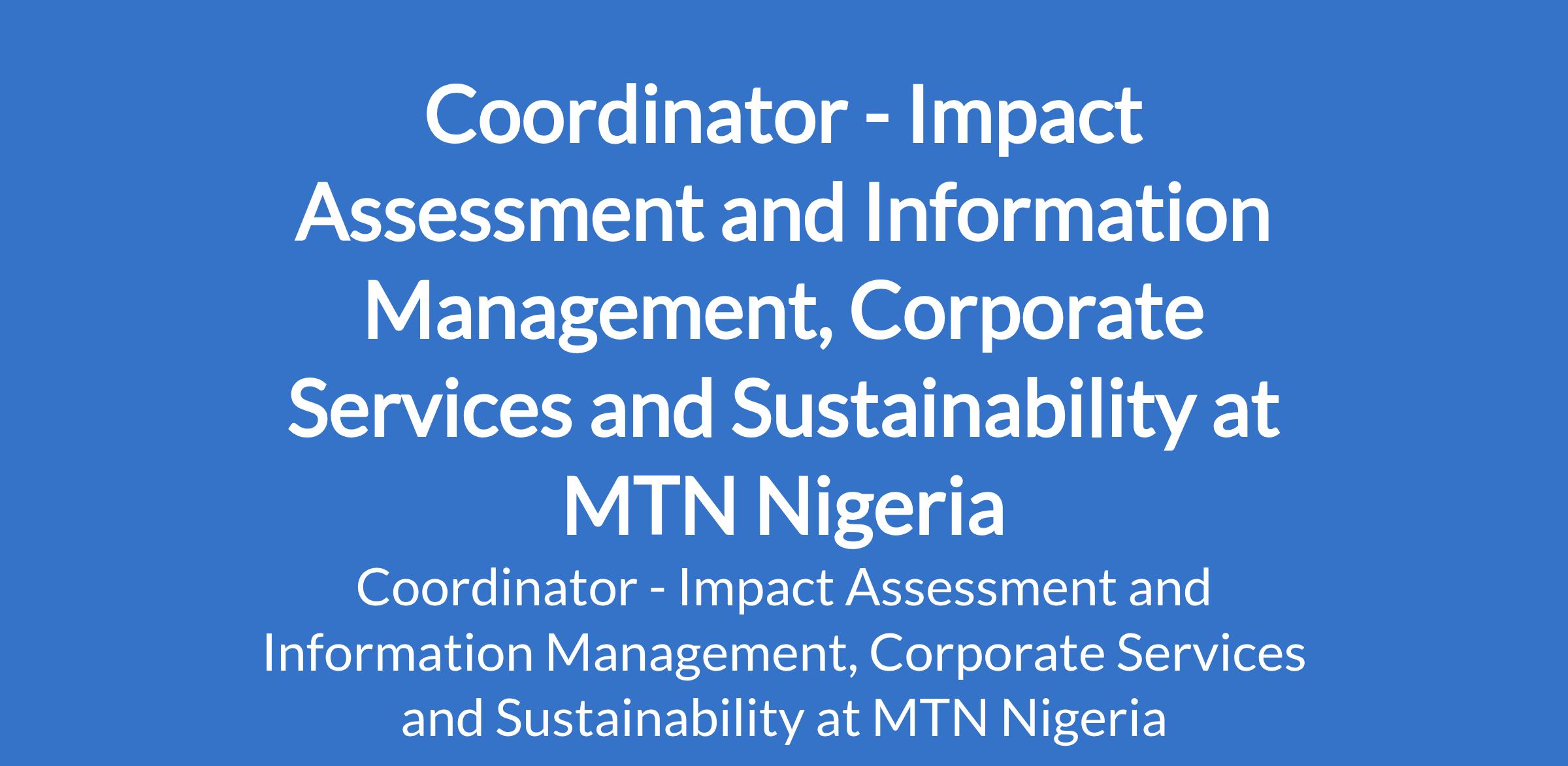 MTN Nigeria is recruiting to fill the position of: Coordinator - Impact Assessment and Information Management, Corporate Services and Sustainability. The position is located in Ikoyi, Lagos State. Interested candidates should possess a First Degree in any relevant discipline with 3-7 years experience in an area of specialization; with experience working with others.