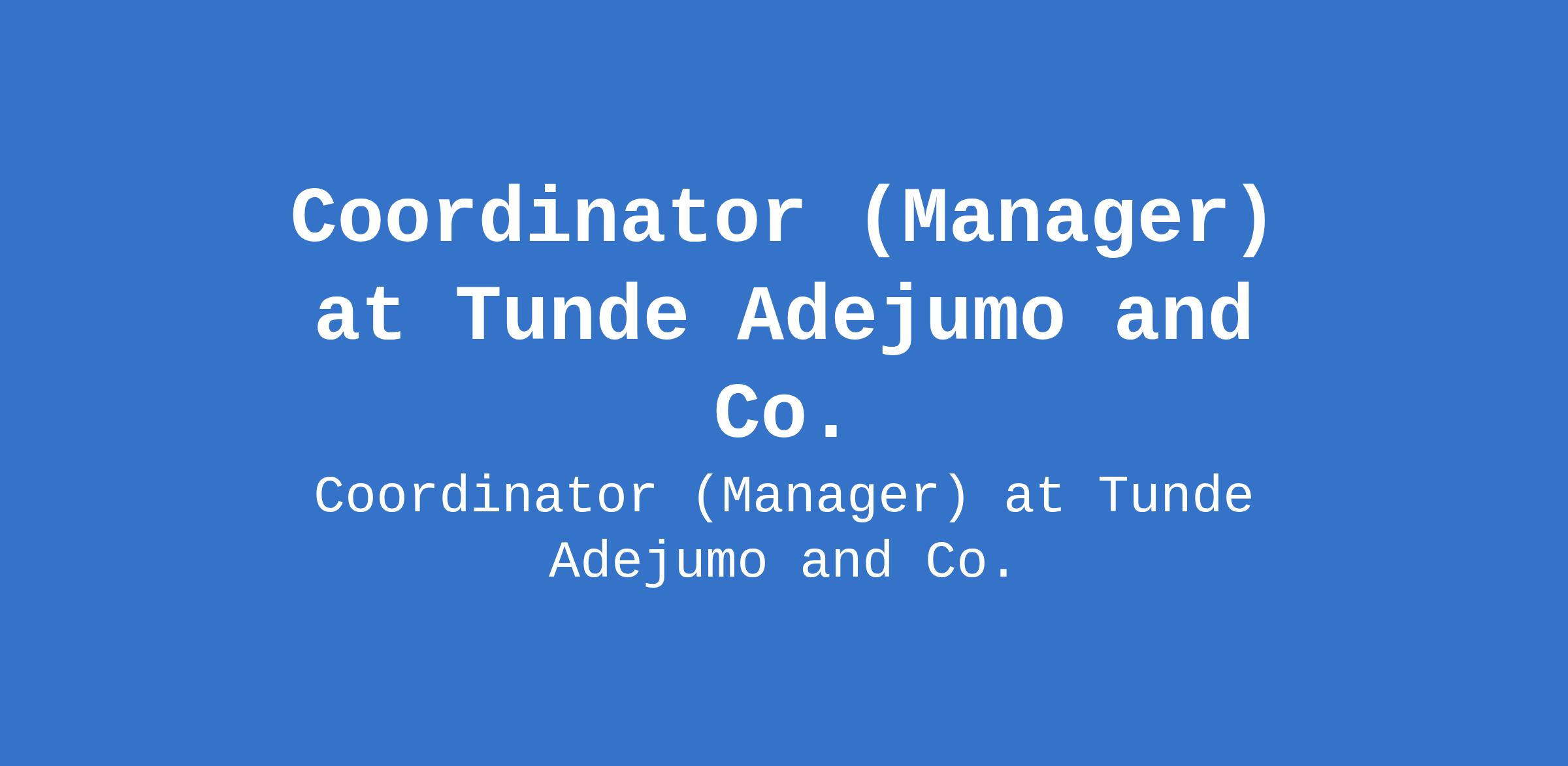Tunde Adejumo and Co. is recruiting to fill the position of: Coordinator (Manager). The position is located in Ibadan, Oyo State. Salary: N150,000 - N200,000 monthly. Interested candidates should possess minimum of OND / HND / Bachelors Degree in Administration or related fields with previous supervisory or coordination experience and should be preferably females.