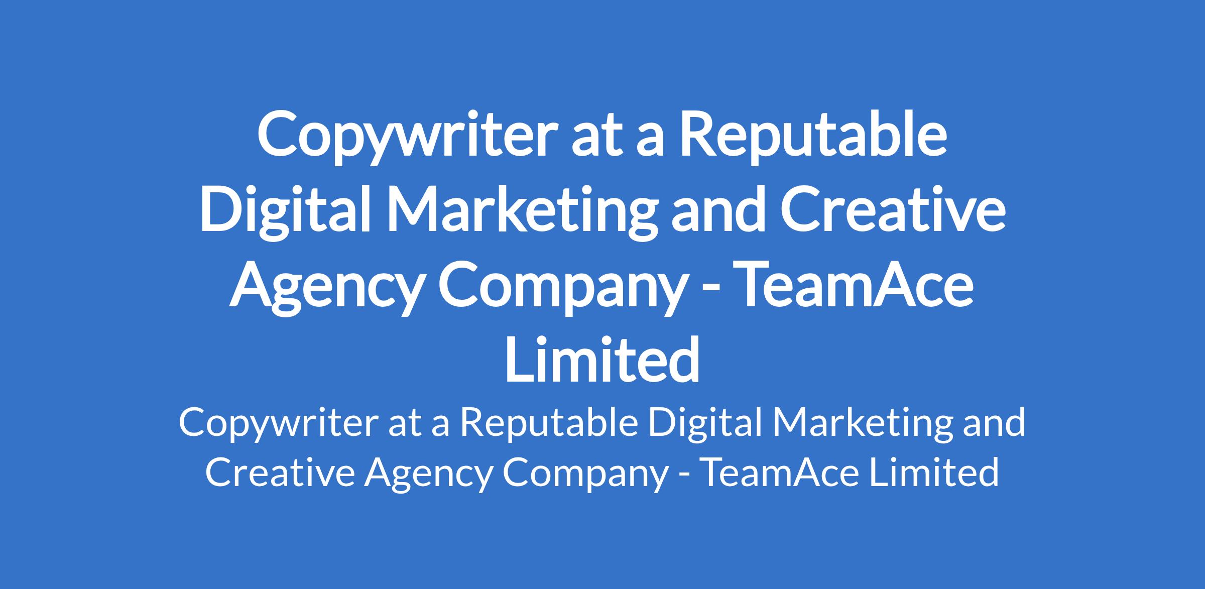 TeamAce Limited - Our client, a reputable organization in the Digital Marketing and Creative Agency sector is recruiting to fill the position of: Copywriter. The position is located in Egbeda, Lagos State. Salary: N150,000 - N200,000 monthly. Interested candidates should possess a Bachelors Degree in Communications, English, Marketing, or a related field with 13 years experience in content writing, copywriting, or script development.