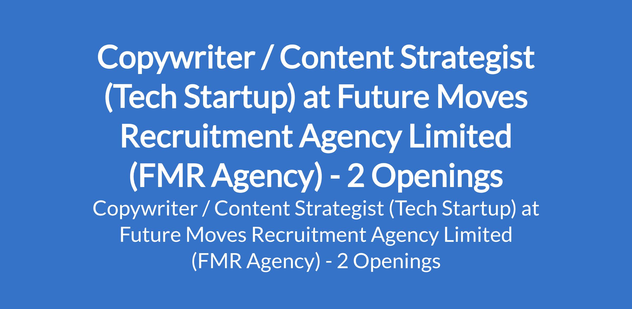 Future Moves Recruitment Agency Limited (FMR Agency) is recruiting to fill the position of: Copywriter / Content Strategist (Tech Startup). The position is located in Abuja (FCT) and Lagos State. Interested candidates should possess relevant qualifications with a minimum of 2 years of experience in SaaS content marketing, preferably in the Edtech or Fintech; Digital Marketing background is a plus.