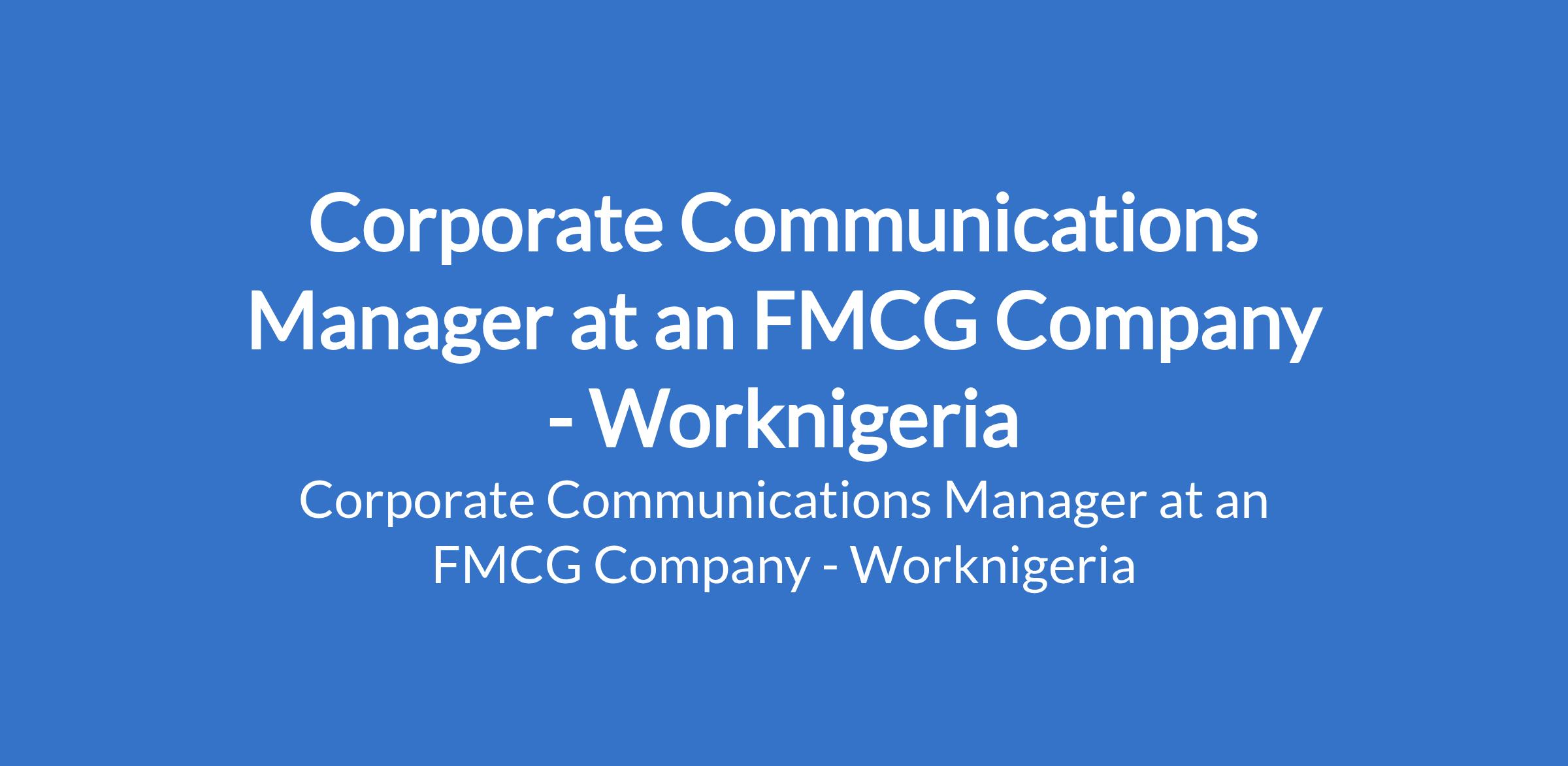 Worknigeria - Our client in the FMCG sector is recruiting to fill the position of: Corporate Communications Manager. The position is located in Lagos State. The ideal candidate will be responsible for ensuring consistent and effective messaging to both internal and external stakeholders while strengthening the companys brand and reputation. Interested candidates should possess a First Degree or its equivalent in Business, Communications, or its equivalent in other business-related discipline with a minimum of 10 years relevant work experience, with at least 5 years in supervisory role in a manufacturing or FMCG environment.