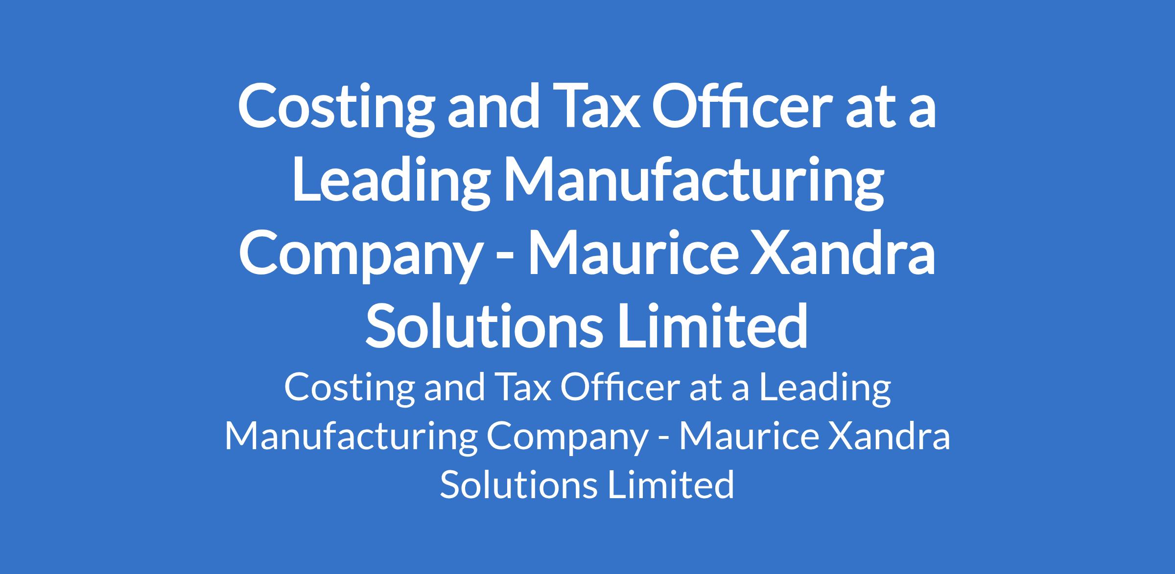 Maurice Xandra Solutions Limited - Our client, a manufacturing company is recruiting to fill the position of: Costing and Tax Officer. The position is located in Nnewi, Anambra State. Interested candidates should possess a minimum of Bachelors Degree / HND in Accounting, Finance, Economics, or Business Administration with at least 2 years of progressive finance/accounting experience, with significant exposure to costing and taxation.