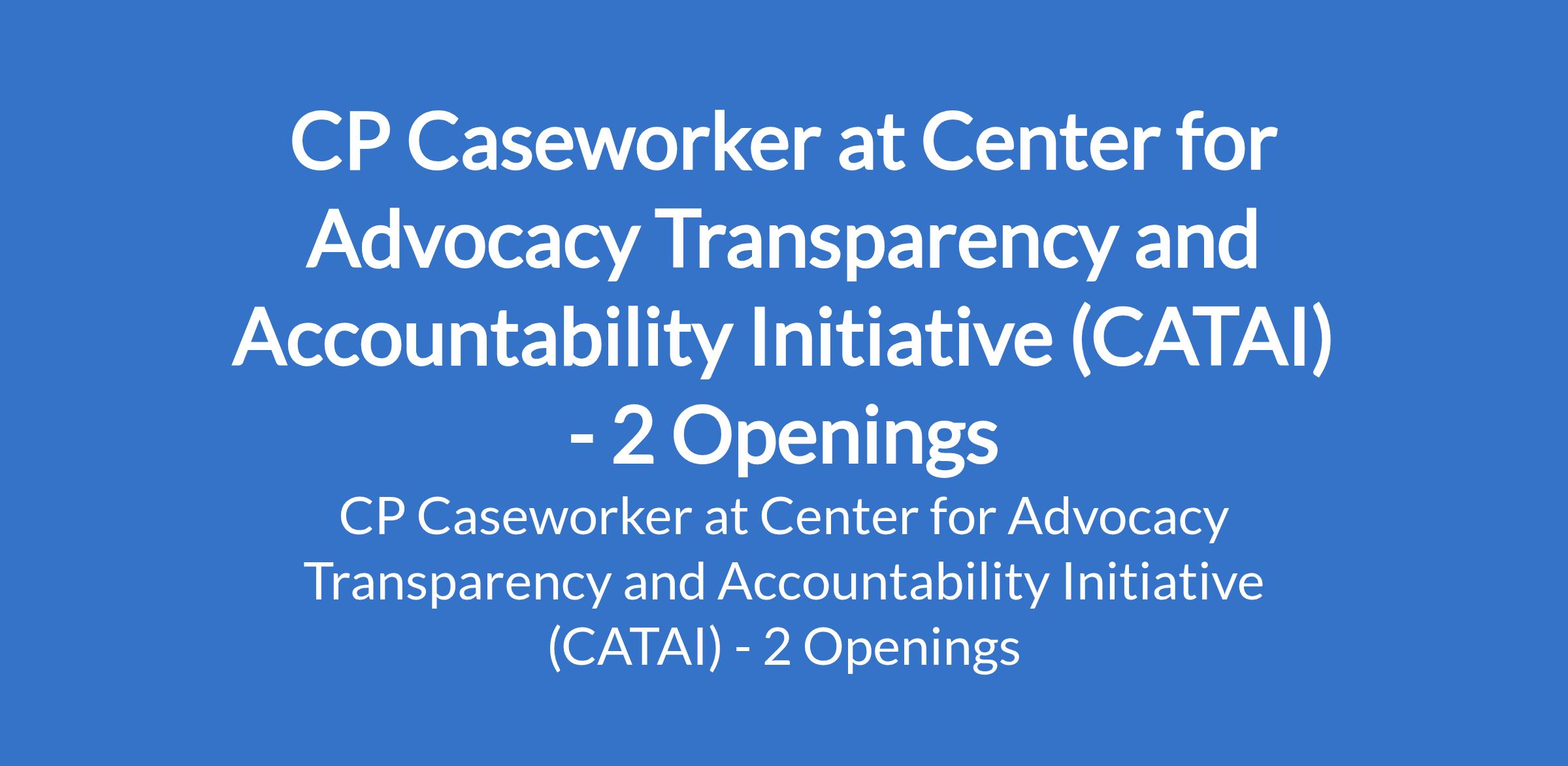 Center for Advocacy Transparency and Accountability Initiative (CATAI) is recruiting to fill the position of: CP Caseworker. The position is located in Ngala and Kaga LGAs, Borno State. Interested candidates should possess a Diploma or Bachelor's Degree in Social Work, Psychology, Sociology, Community Development or a related field with 1 2 years of experience in child protection case management, social work or a related field.