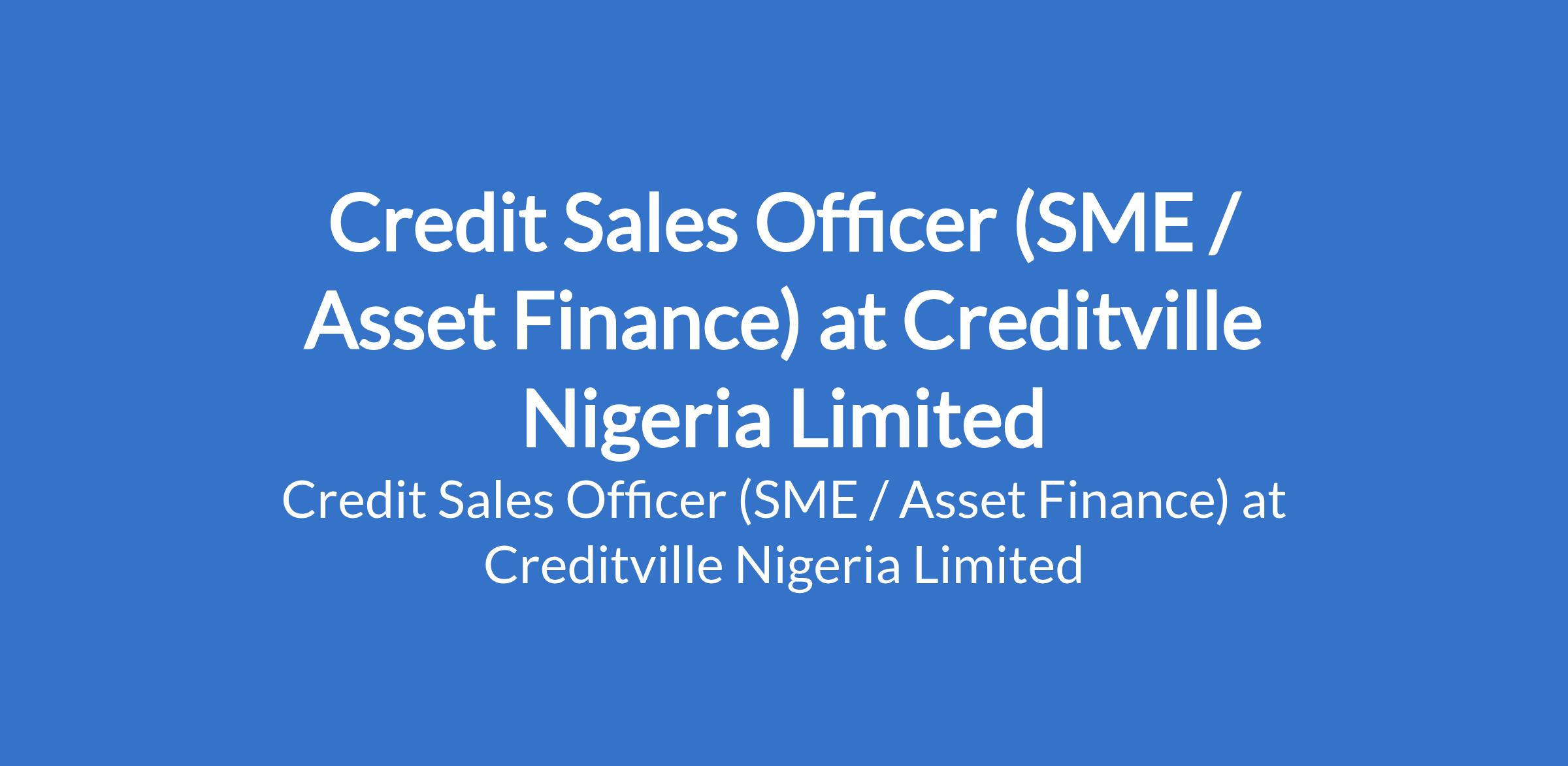 Creditville Nigeria Limited is recruiting to fill the position of: Credit Sales Officer (SME / Asset Finance). The position is located in Ikeja, Lagos State. Interested candidates should possess a Bachelor's Degree in Finance, Accounting, Business Administration, or a related field; MCIB certificate is an added advantage.