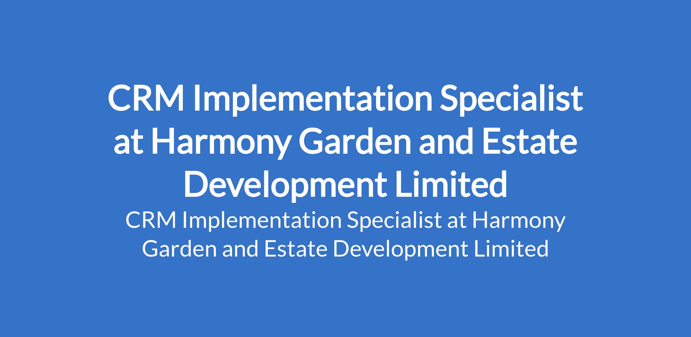 Harmony Garden and Estate Development Limited is recruiting to fill the position of: CRM Implementation Specialist. The position is located in Ibeju Lekki, Lagos State. Interested candidates should possess relevant qualifications and work experience.