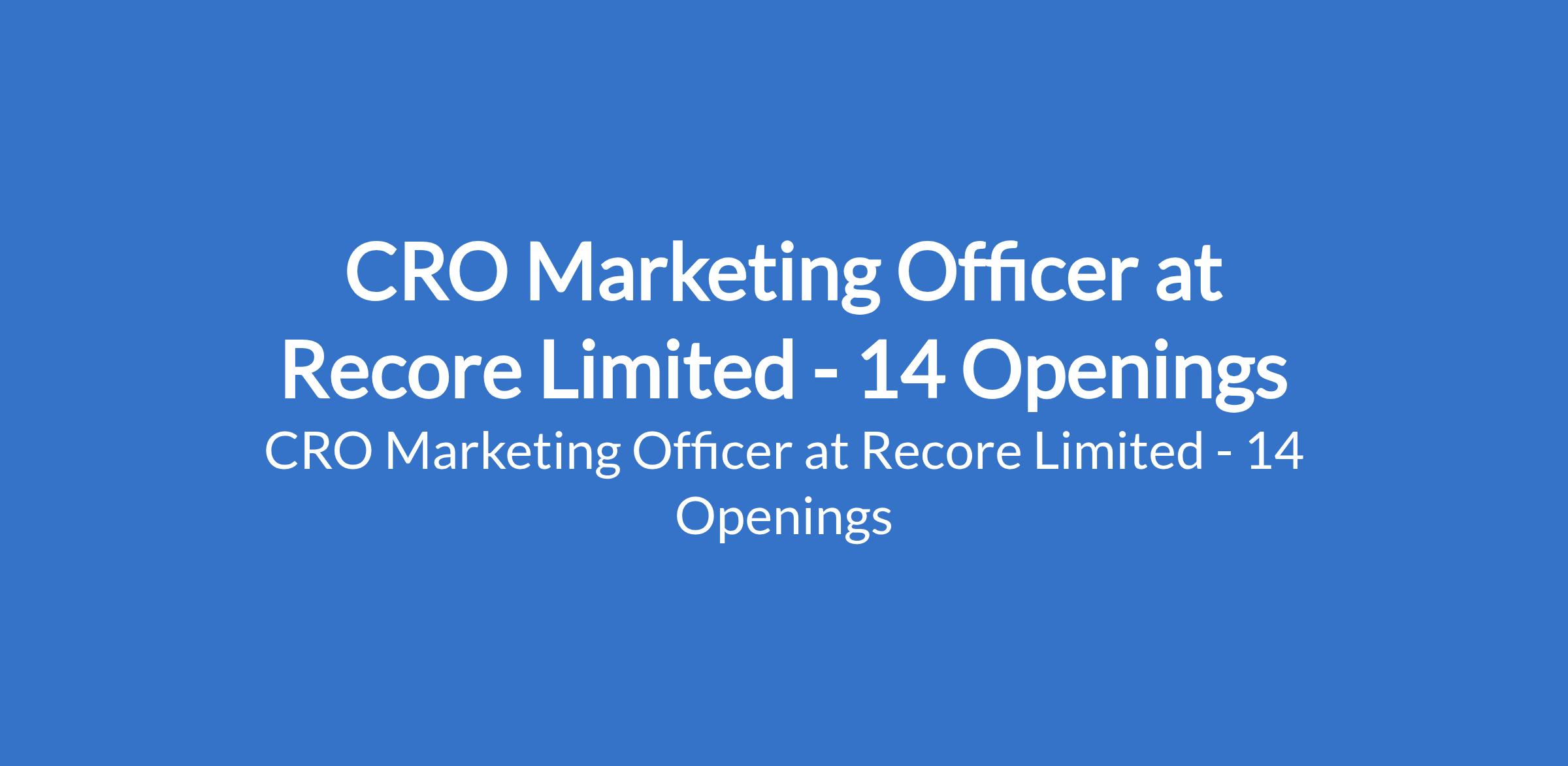 Recore Limited is recruiting to fill the position of: CRO Marketing Officer. The position is located in Abia, Abuja (FCT), Bauchi, Bayelsa, Benue, Cross River, Ekiti, Kaduna, Kano, Katsina, Kebbi, Kwara, Yobe and Zamfara States. Salary: N147,000 / Month. Interested candidates should possess minimum of a BSc (2:2 or higher) in Marketing, Business Administration, or related fields.