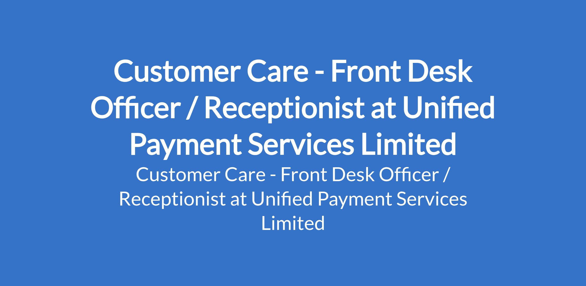 Unified Payment Services Limited is recruiting to fill the position of: Customer Care - Front Desk Officer / Receptionist. The position is located in Victoria Island, Lagos State. Interested candidates should possess a B.Sc. / HND in any discipline with a minimum of 1 year of cognitive experience with a reputable organization.