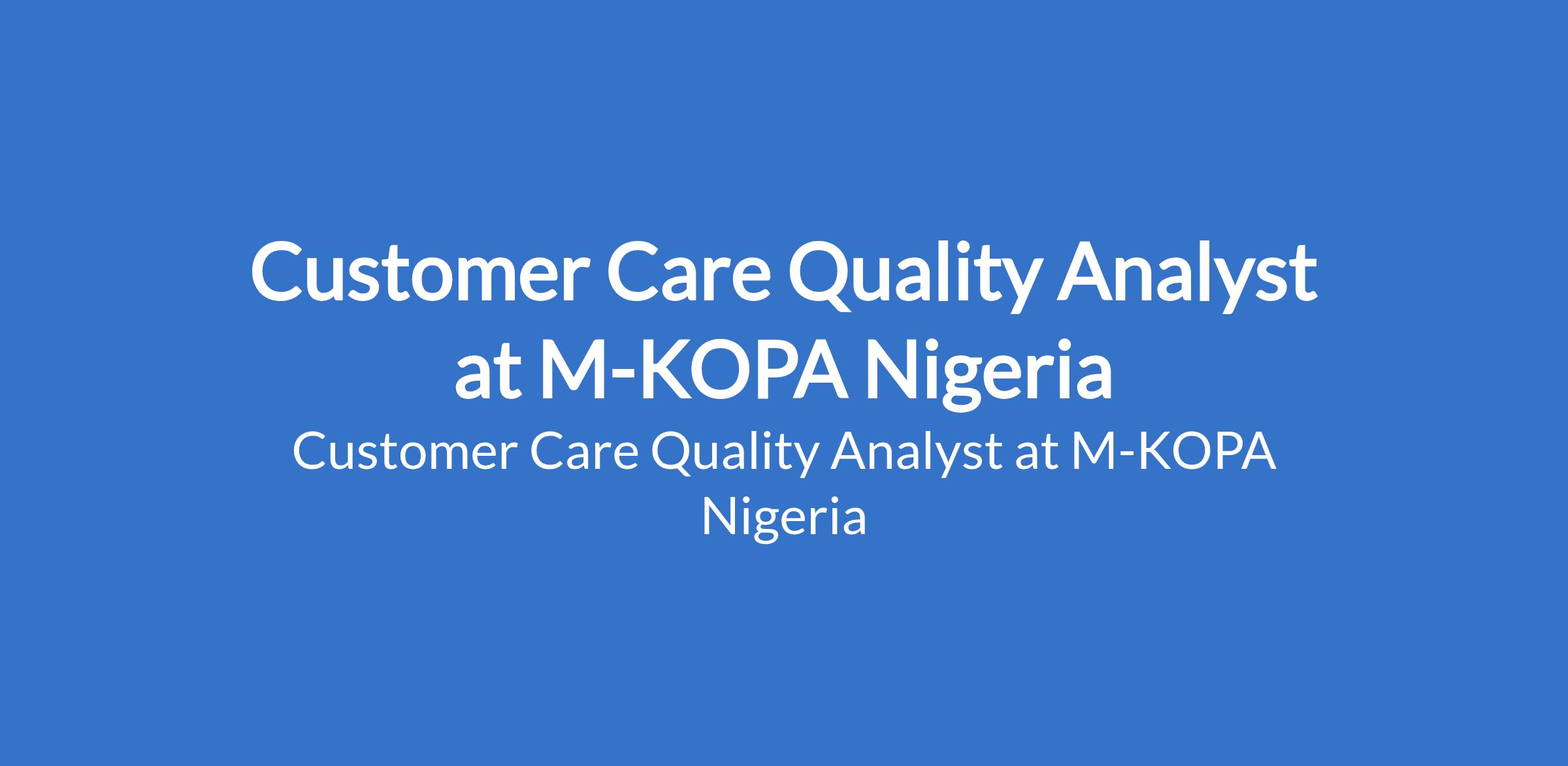 M-KOPA Nigeria is recruiting to fill the position of: Customer Care Quality Analyst. The position is located in Lagos State. Interested candidates should possess relevant qualifications with demonstrable experience in a customer care or customer service environment, with a track record of understanding what good looks like on the front line.