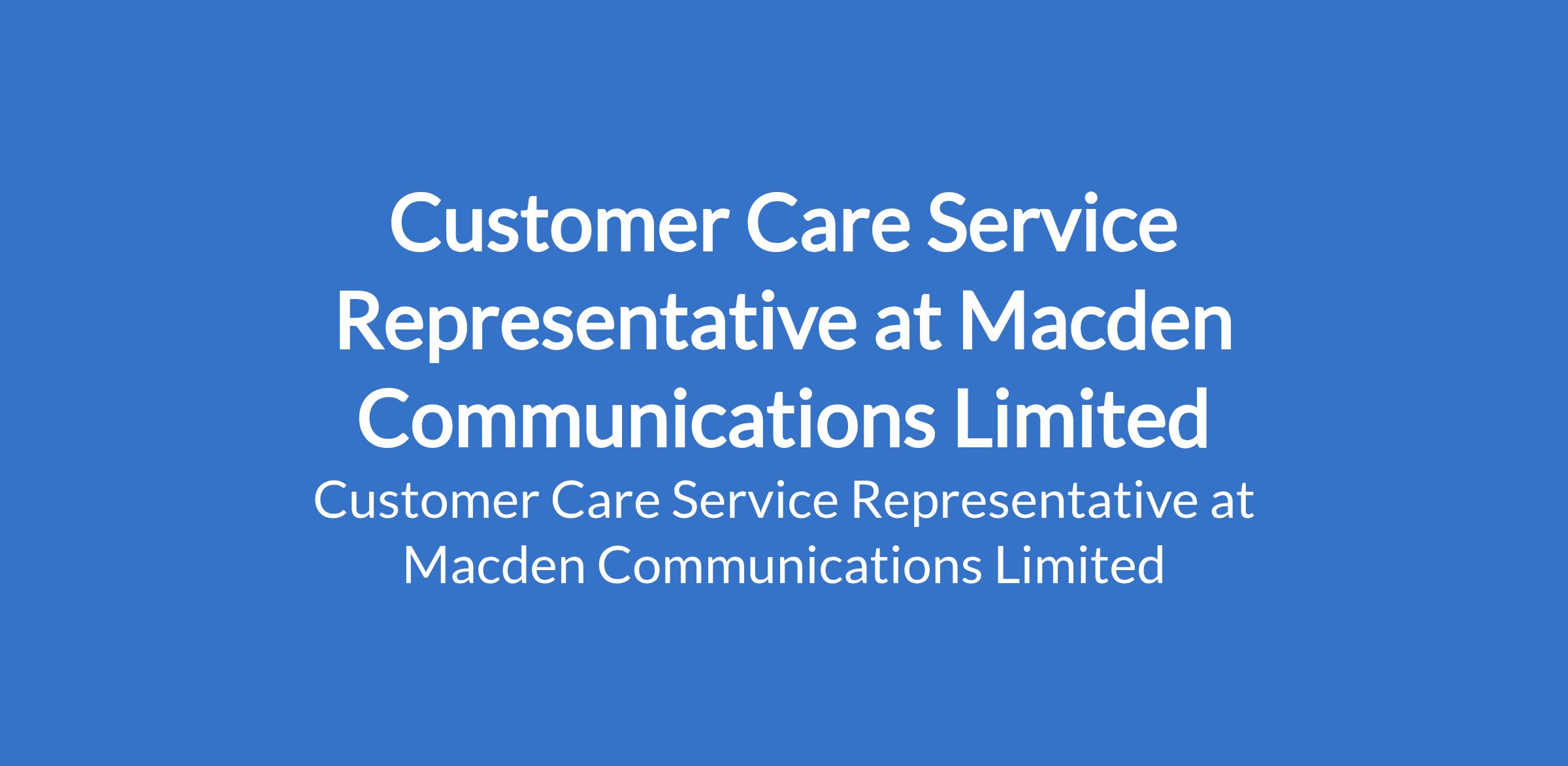 Macden Communications Limited is recruiting to fill the position of: Customer Care Service Representative, Females Only. The position is located in Ogba, Lagos State. Salary: N80,000 - N100,000 / month. Interested candidates should possess relevant qualifications with years of work experience.