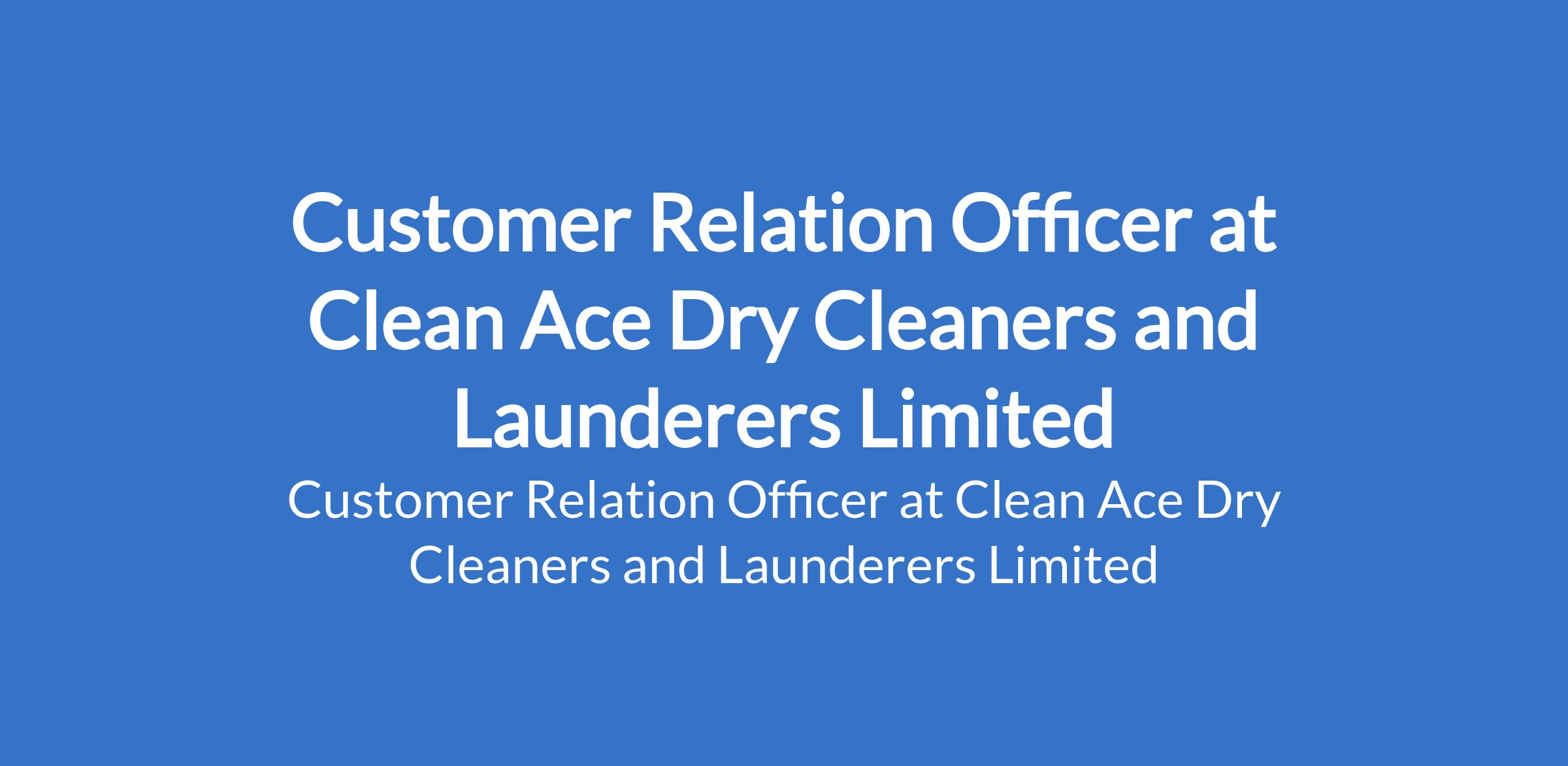 Clean Ace Dry Cleaners and Launderers Limited is recruiting to fill the position of: Customer Relation Officer. The position is located in Island, Lagos State. Salary: N85,000 per month. Interested candidates should possess a minimum of OND qualification with previous customer service experience.