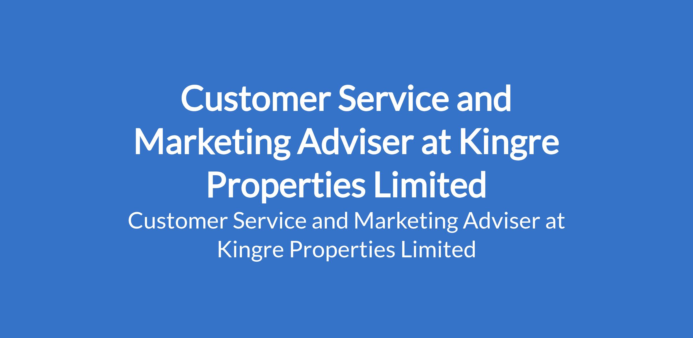 Kingre Properties Limited is recruiting to fill the position of: Customer Service and Marketing Adviser. The position is located in Chevron, Lagos State. Salary: N150,000 - N200,000 monthly. Interested candidates should possess an OND/HND/BSc in Marketing, Business Administration, Mass Communication, or related field with 13 years experience in customer service, marketing, or real estate.