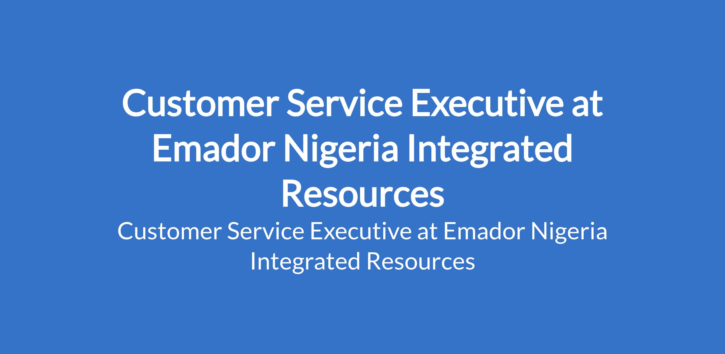 Emador Nigeria Integrated Resources is recruiting to fill the position of: Customer Service Executive. The position is located in Ikeja, Lagos State. Salary: N100,000 - N150,000 per month. Interested candidates should possess a relevant qualification.