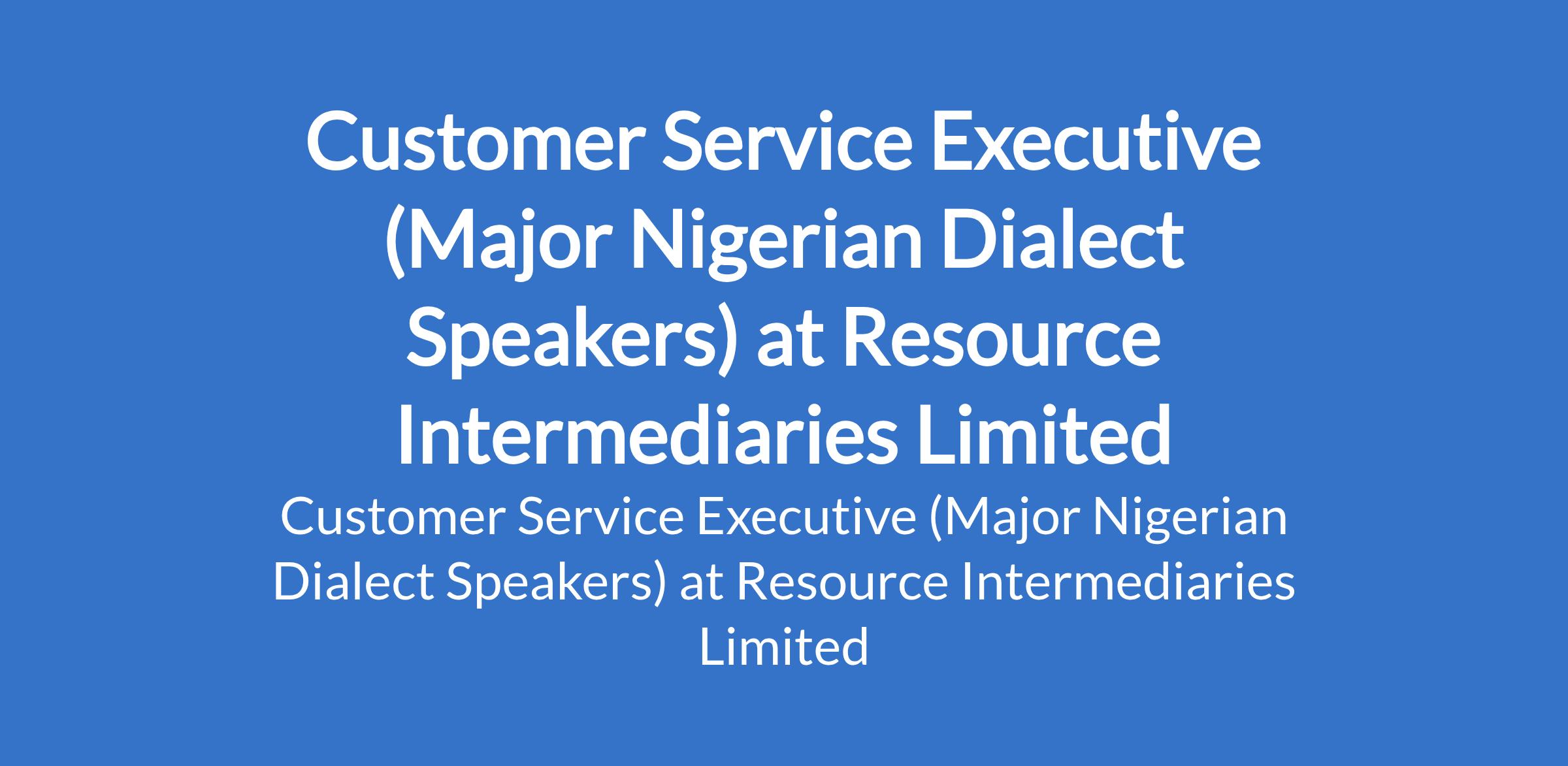 Resource Intermediaries Limited is recruiting to fill the position of: Customer Service Executive (Major Nigerian Dialect Speakers). Salary: N150,000 - N200,000 per month. The position is located in Akinyele-Ibadan, Oyo State. Interested candidates should possess relevant qualifications with 6+ years of experience in a similar role and must be familiar with Commercial phone systems, Customer relationship management software and Microsoft Office Suite (Word, Outlook, and PowerPoint).