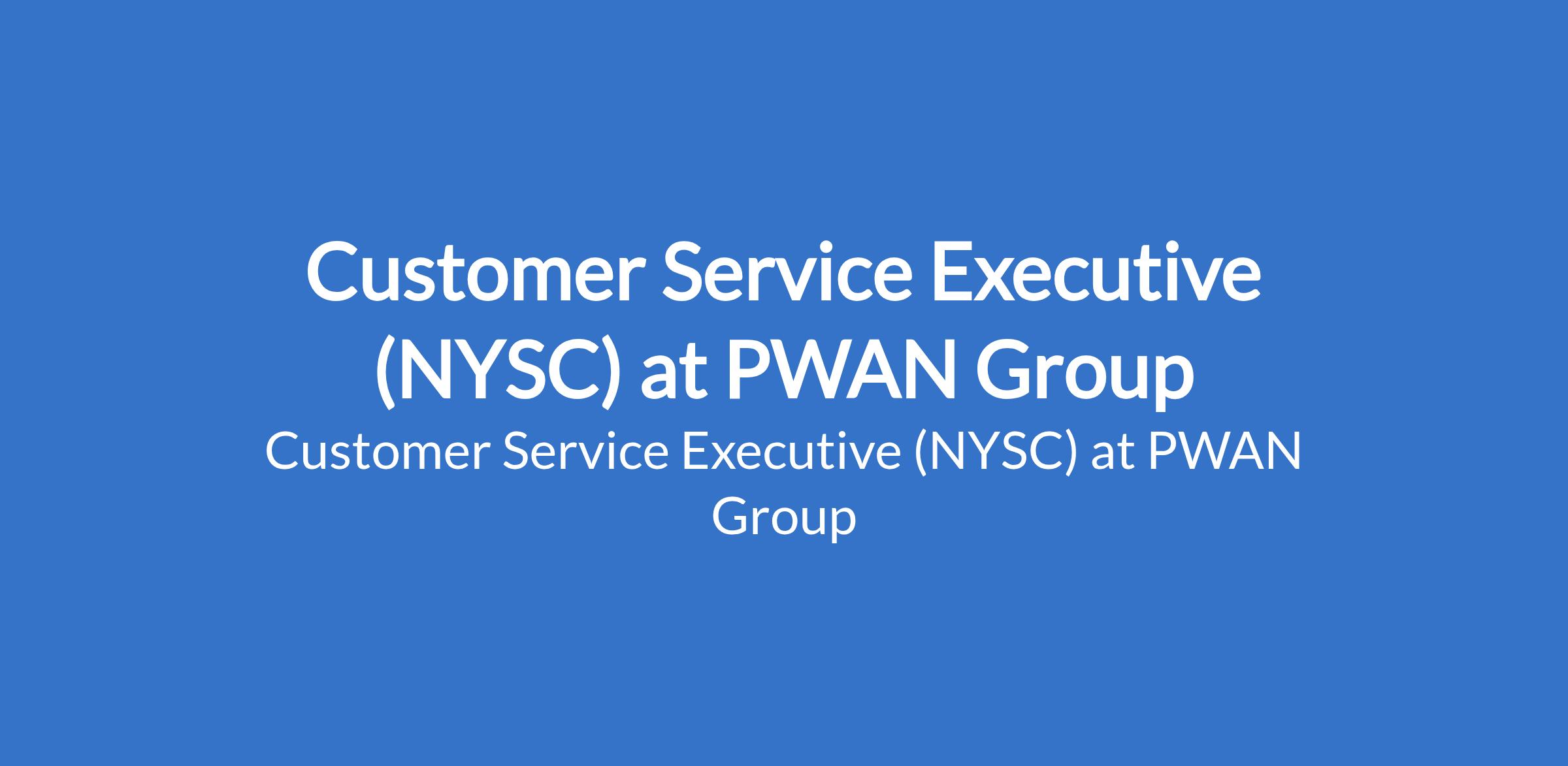 PWAN Group is recruiting to fill the position of: Customer Service Executive (NYSC). The position is located in Sangotedo / Ajah, Lagos State. Salary: N70,000 monthly. Interested candidates must be a serving NYSC Corps Member and must reside around Ajah / Sangotedo or its environs; previous customer service experience is an added advantage.