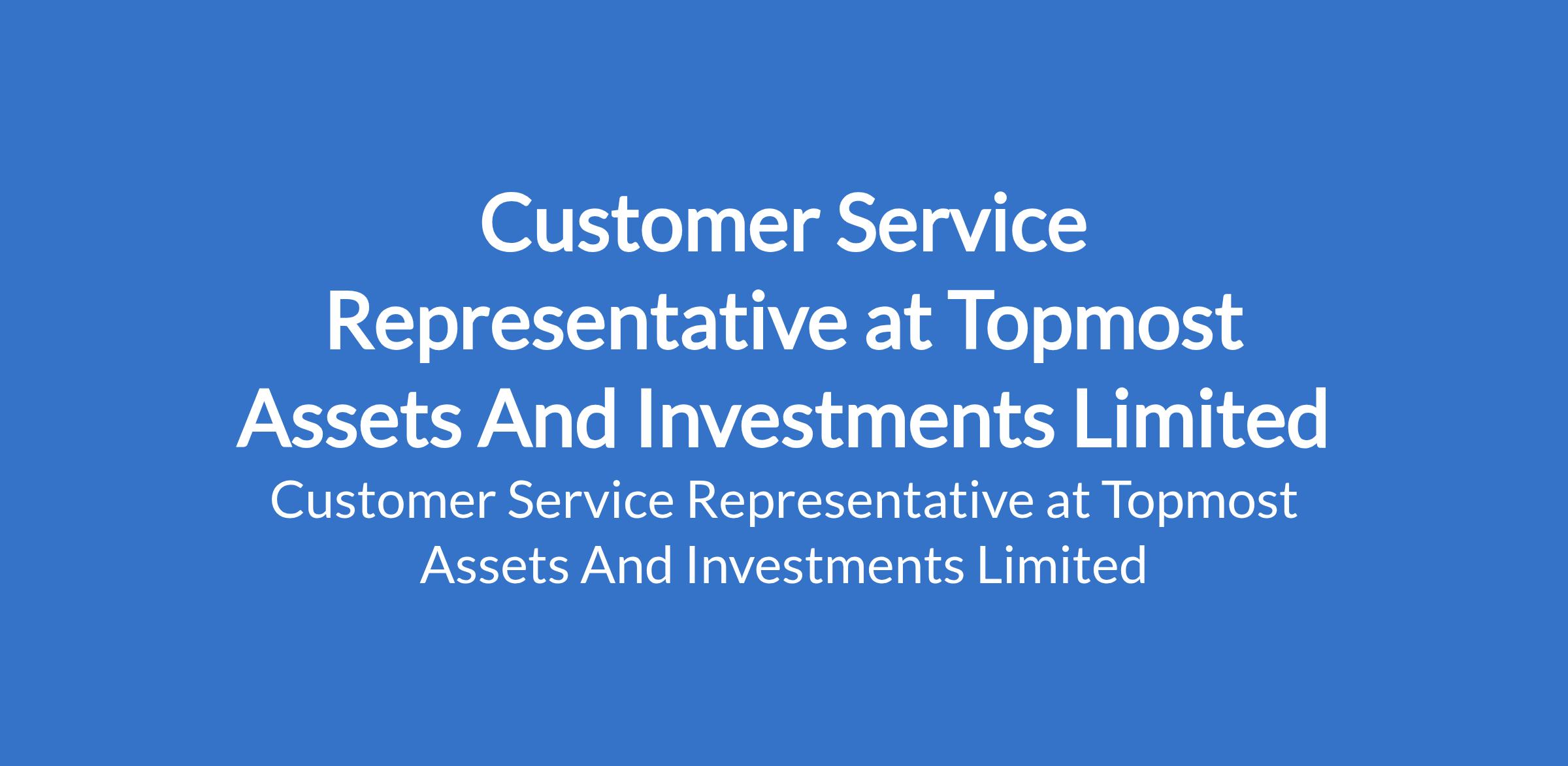 Topmost Assets And Investments Limited is recruiting to fill the position of: Customer Service Representative. The position is located in Ikeja, Lagos State. Salary: N100,000 - N150,000 per month. Interested candidates should possess a High School Diploma with proven customer support experience or experience as a Client Service Representative.