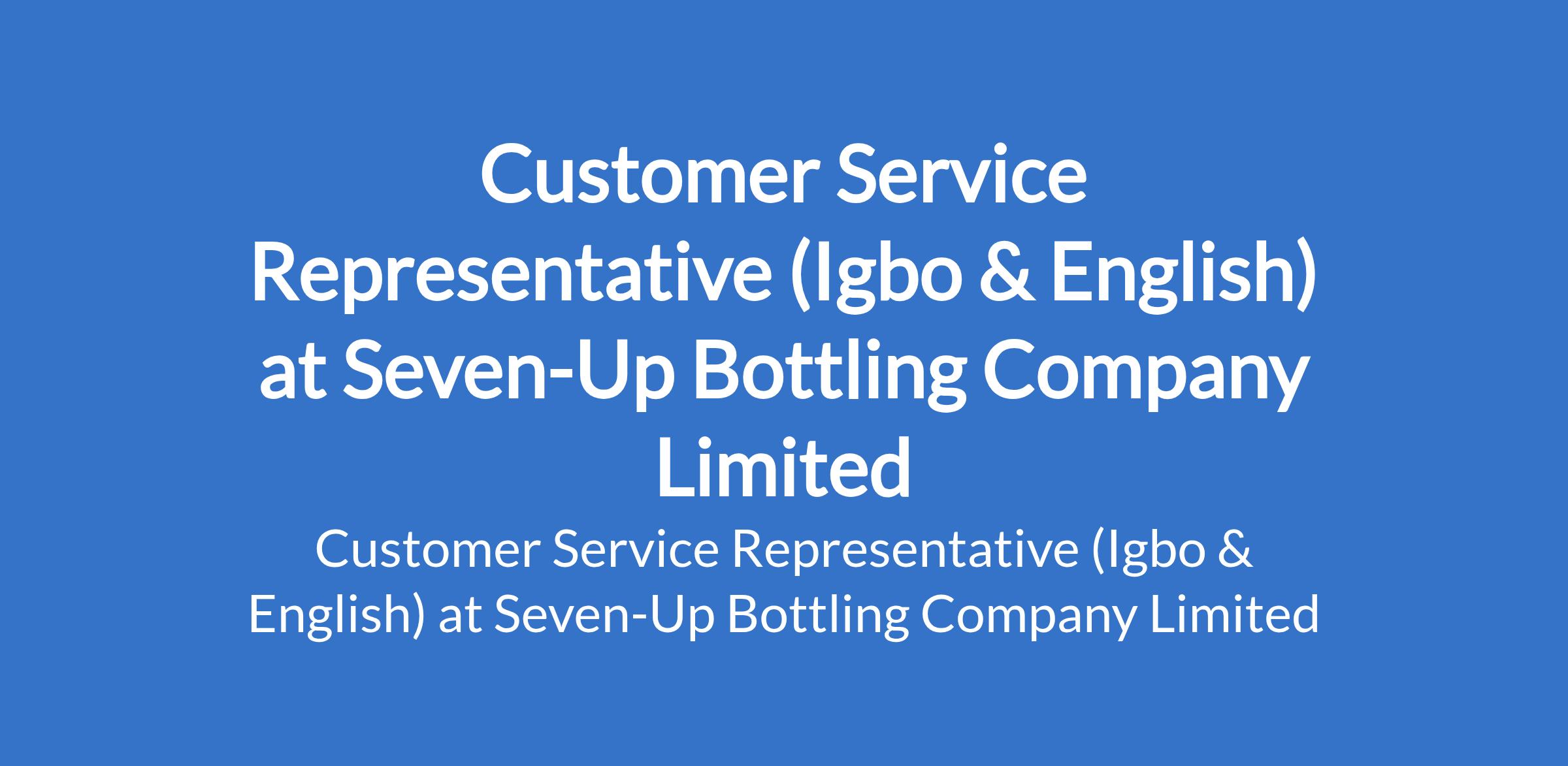Seven-Up Bottling Company Limited is recruiting to fill the position of: Customer Service Representative (Igbo & English). The position is located in Ijora, Lagos State. Interested candidates should possess a Bachelor's Degree in Business Administration or relevant fields with a minimum of 2 years proven experience in a customer service position in a manufacturing industry or relevant industry and must be proficient in Igbo language and fluent in English.