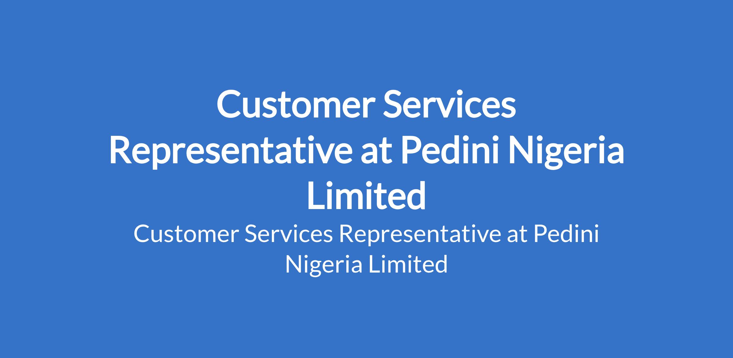 Pedini Nigeria Limited is recruiting to fill the position of: Customer Services Representative. The position is located in Victoria Island, Lagos State. Salary: N250,000 - N300,000 monthly. Interested candidates should possess a Bachelors Degree with 5 - 10 years experience.