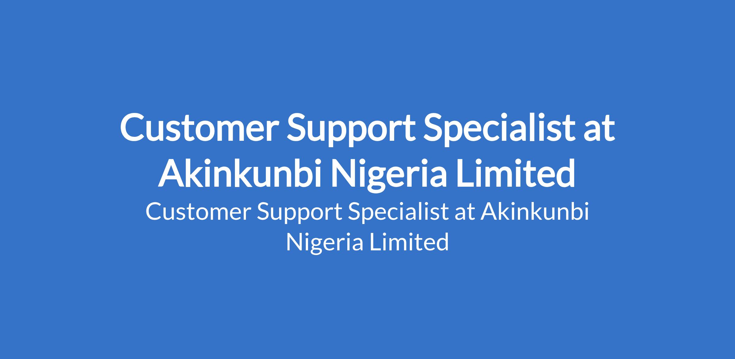 Akinkunbi Nigeria Limited is recruiting to fill the position of: Customer Support Specialist. The position is located in Ikeja, Lagos State. Salary: N100,000 - N150,000 monthly. Interested candidates should possess an OND / HND qualification with 1 year experience