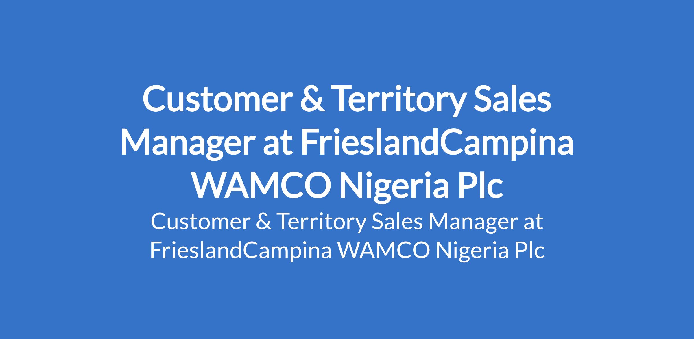 FrieslandCampina WAMCO Nigeria Plc is recruiting to fill the position of: Customer & Territory Sales Manager. The position is located in Bauchi State. Interested candidates should possess a Bachelor`s / Master`s Degree in any field with 7+ years experience of Sales management.