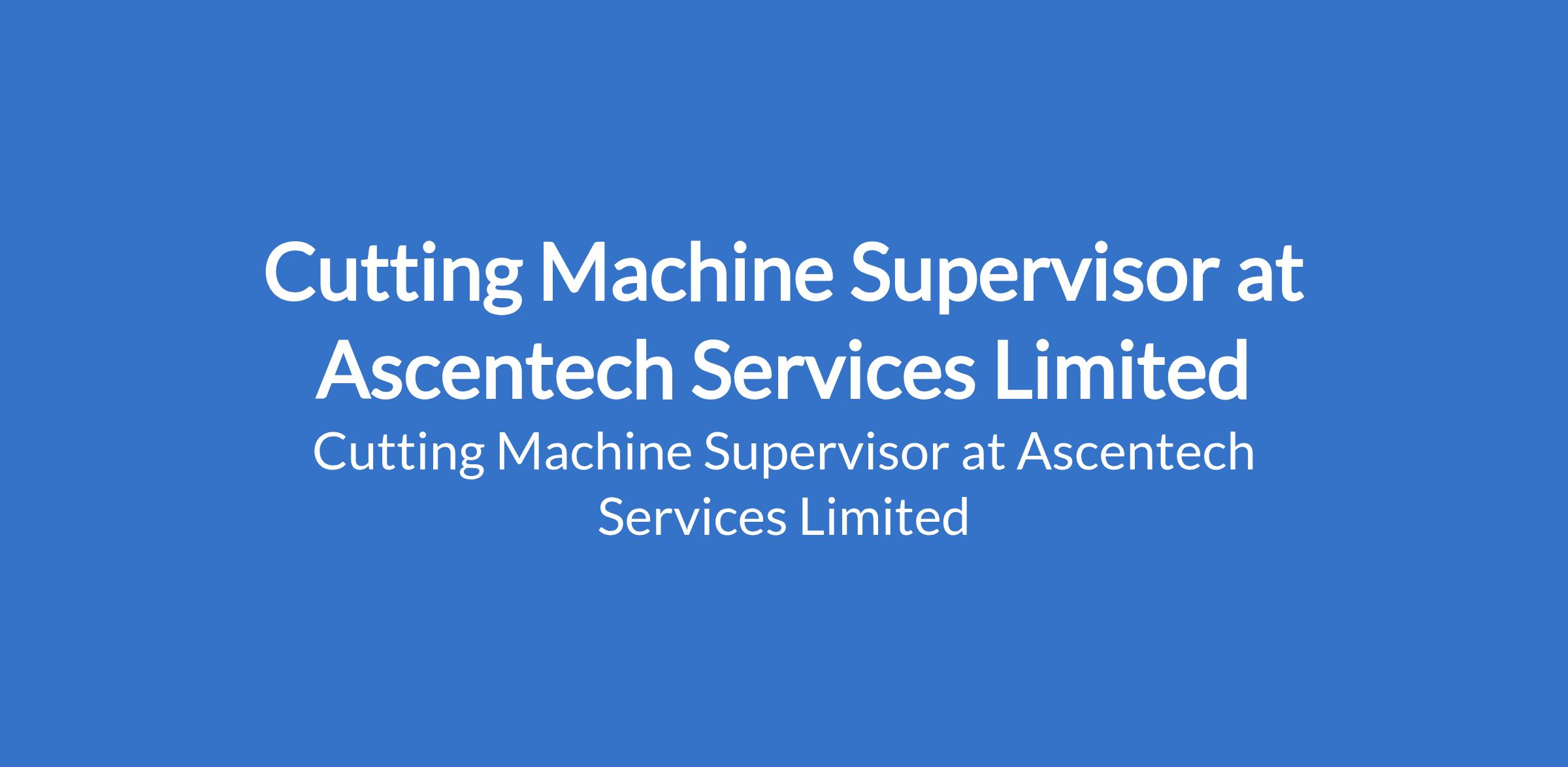 Ascentech Services Limited is recruiting to fill the position of: Cutting Machine Supervisor. The position is located in Obanikoro, Lagos State. Salary: N130,000 N150,000 per month. Interested candidates should possess an OND/HND in Engineering or related fields with 24 years experience in manufacturing (nylon/plastics preferred).