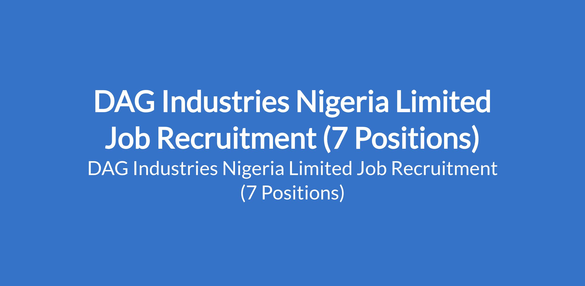 DAG Industries Nigeria Limited is recruiting to fill the following positions in Lagos and Edo States: State: Collection Officer, Credit Officer, Territory Development Officer, Field Verification Officer, Technology Sales Manager, Dispatch Warehouse Manager, and Territory Sales Officer.