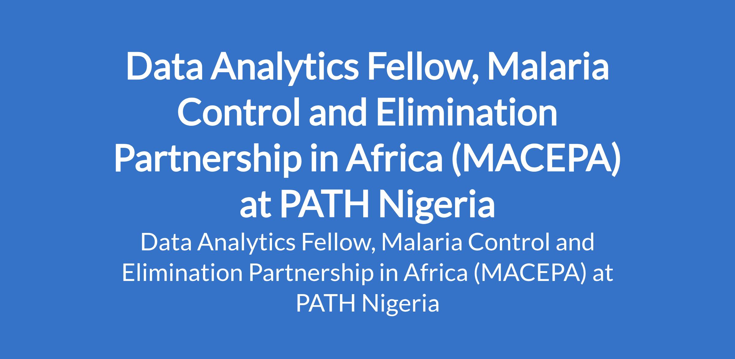 PATH Nigeria is recruiting to fill the position of: Data Analytics Fellow, Malaria Control and Elimination Partnership in Africa (MACEPA). The position is located in Abuja. Interested candidates should possess a Masters Degree in Public Health, Epidemiology, Health-related Data Science or similar fields, plus at least one year of relevant quantitative experience.