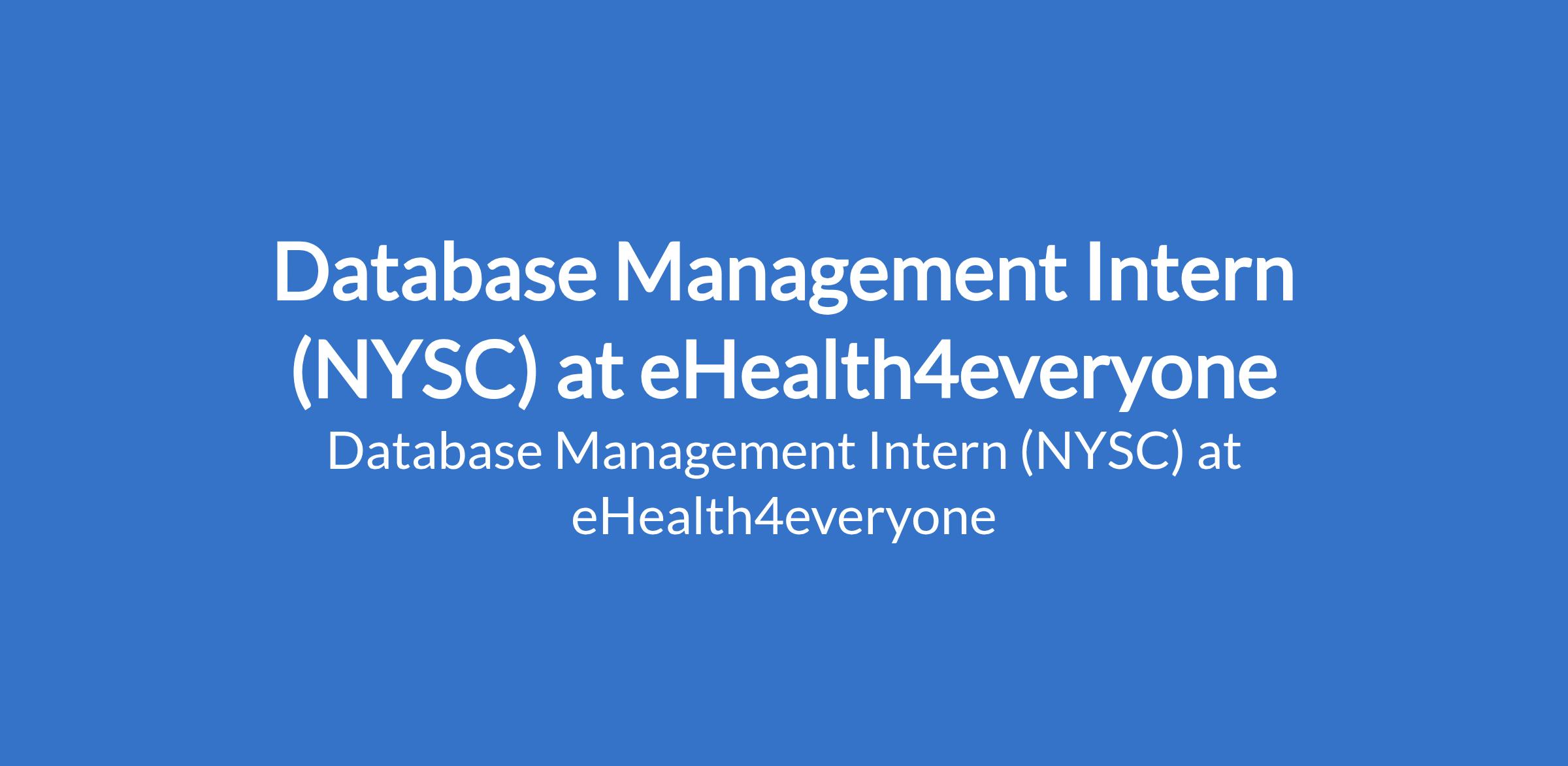 eHealth4everyone is recruiting to fill the position of: Database Management Intern (NYSC). The position is located in Abuja (FCT). Interested candidates currently pursuing or recently completed a Degree in Computer Science, IT, Data Science, or related field.
