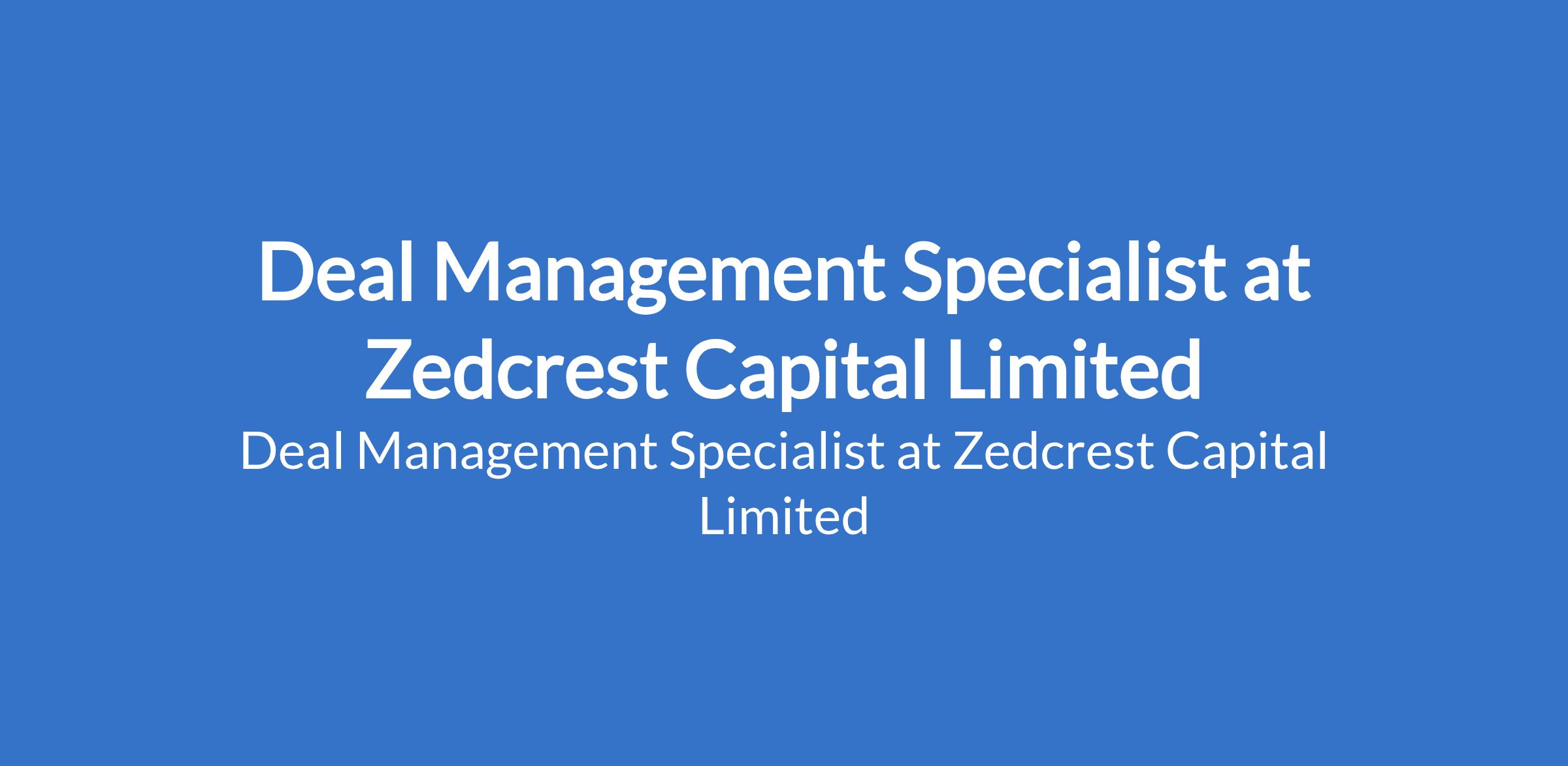 Zedcrest Capital Limited is recruiting to fill the position of: Deal Management Specialist. The position is located in Lagos State. Interested candidates should possess a Bachelors Degree in Business, Finance, Economics, Law, or a related field with 36 years experience in deal management, commercial operations, partnerships, or a similar role.
