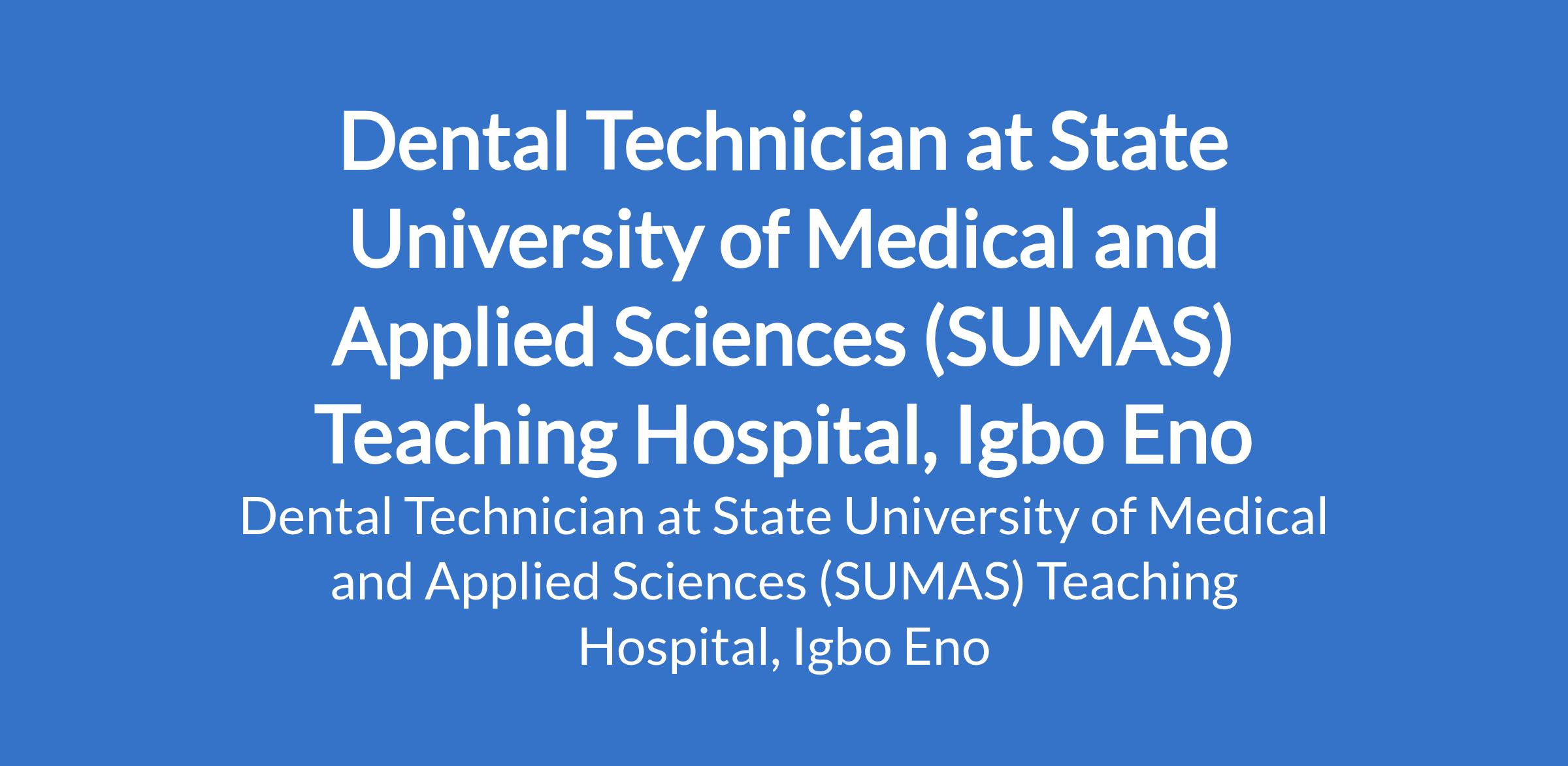 State University of Medical and Applied Sciences (SUMAS) Teaching Hospital, Igbo Eno invites applications from suitable candidates for the position of: Dental Technician. The position is located in Enugu State. Interested candidates should possess relevant qualifications with 3 years training programme at the School of Health Technology and obtained the registration of the institute of Laboratory Technology of Nigeria for Technician cadre