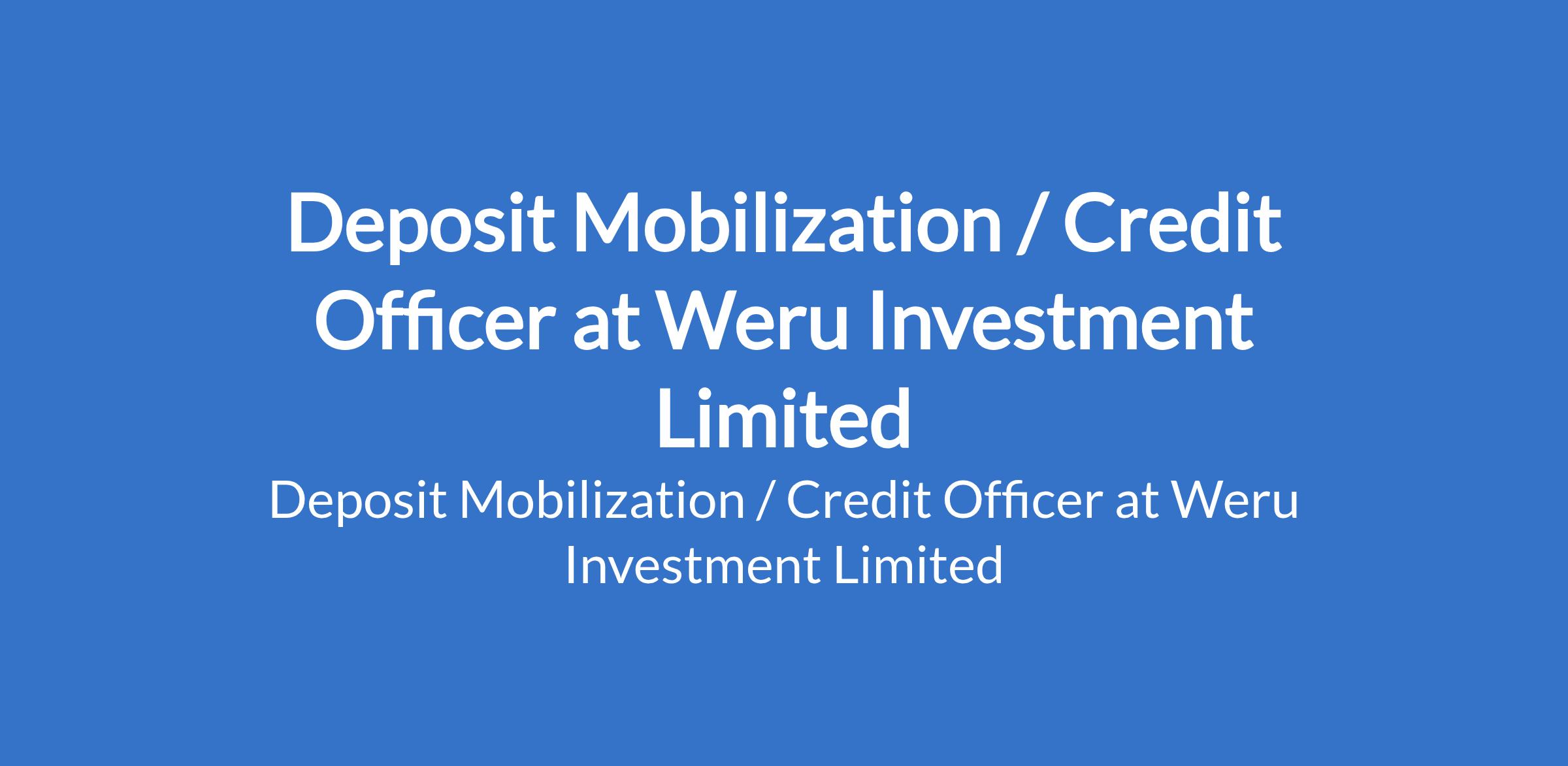 Weru Investment Limited is recruiting to fill the position of: Deposit Mobilization / Credit Officer. The position is located in Ago Palace Way, Lagos State. Salary: N50,000 - N100,000 per month. Interested candidates should possess relevant qualifications.